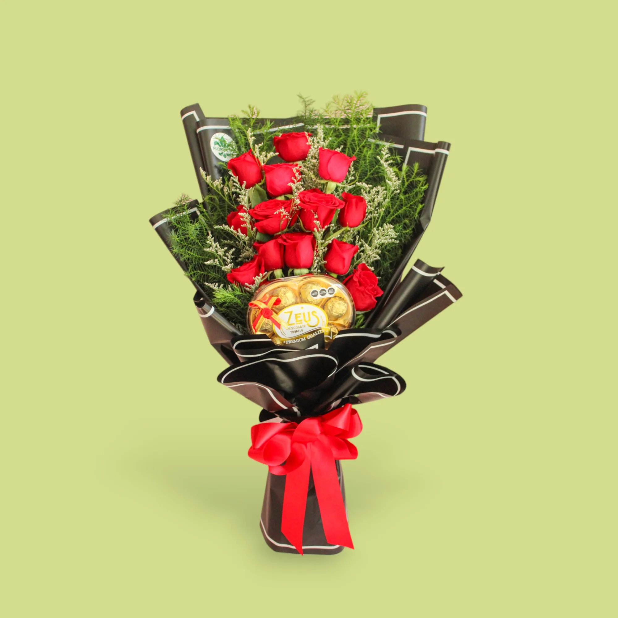 Hermoso ramillete elaborado con rosas rojas, caspia y pino canadiense, envuelto en elegante papel coreano y adornado con un lazo en cinta de tela acompañado de chocolate zeus.