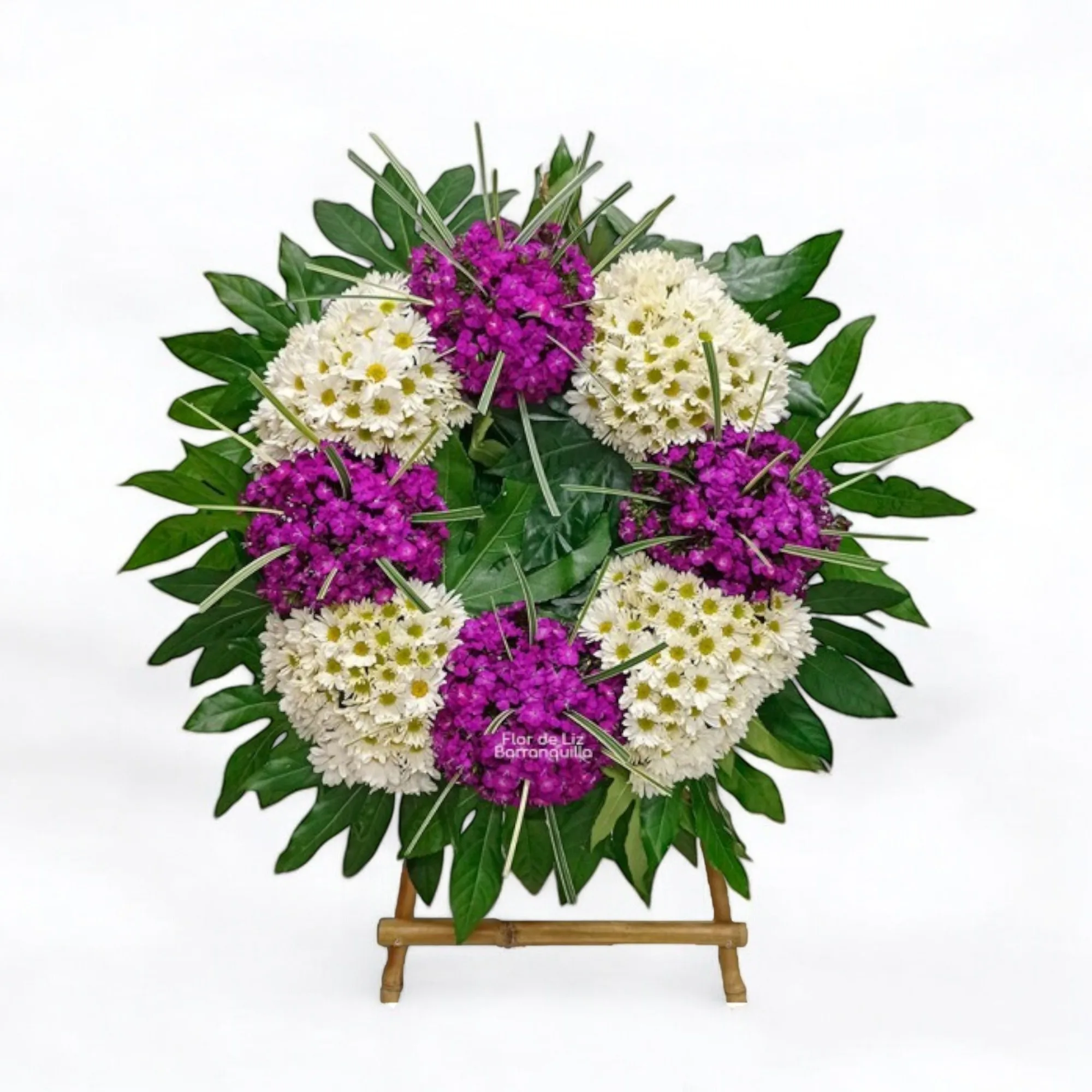 Corona fúnebre elaborada con margaritas blancas y gypsi morada acompañada de manito de Dios y cintilla.