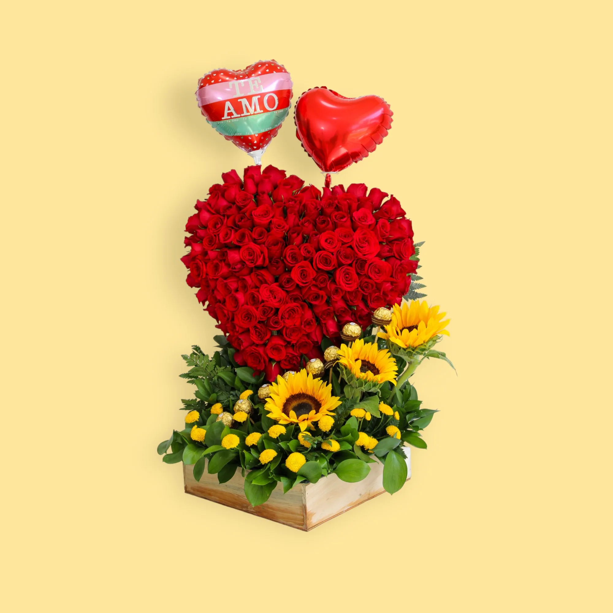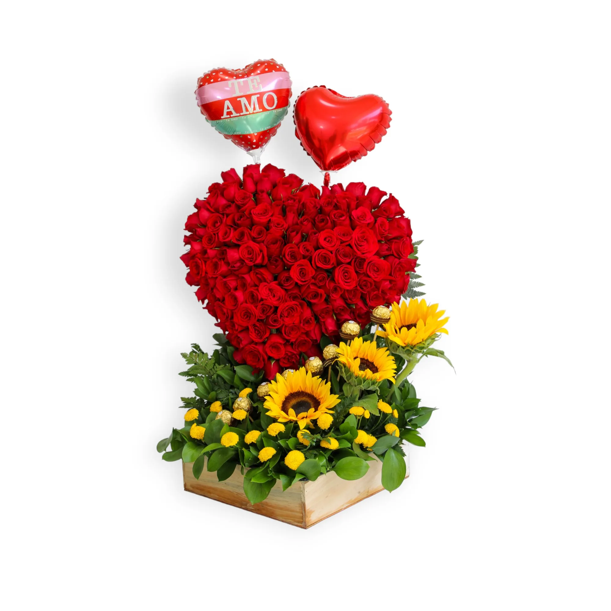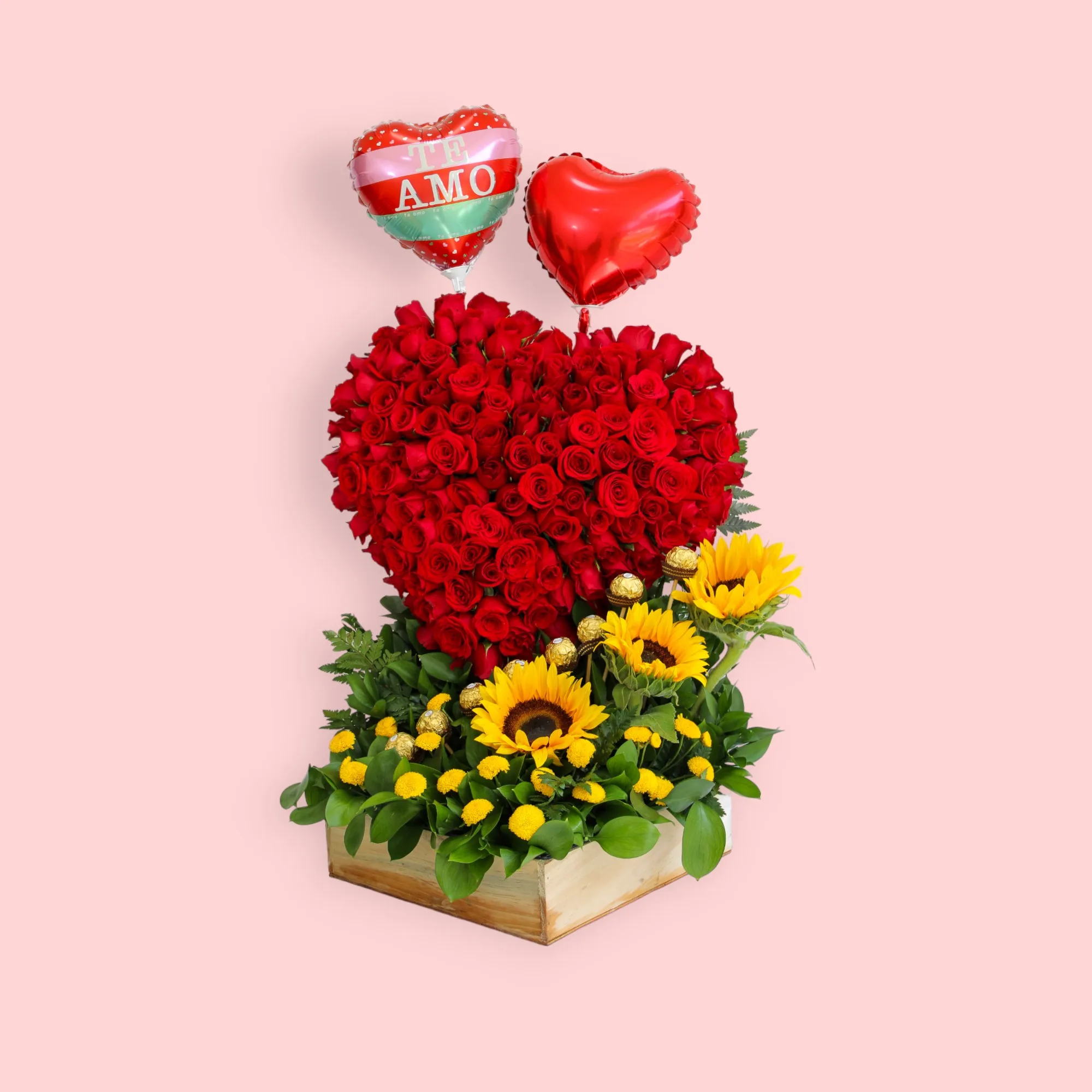 Este arreglo combina rosas rojas en forma de corazón, girasoles radiantes, pinoquios, chocolates Ferrero, globos pequeños y follaje en rusco.