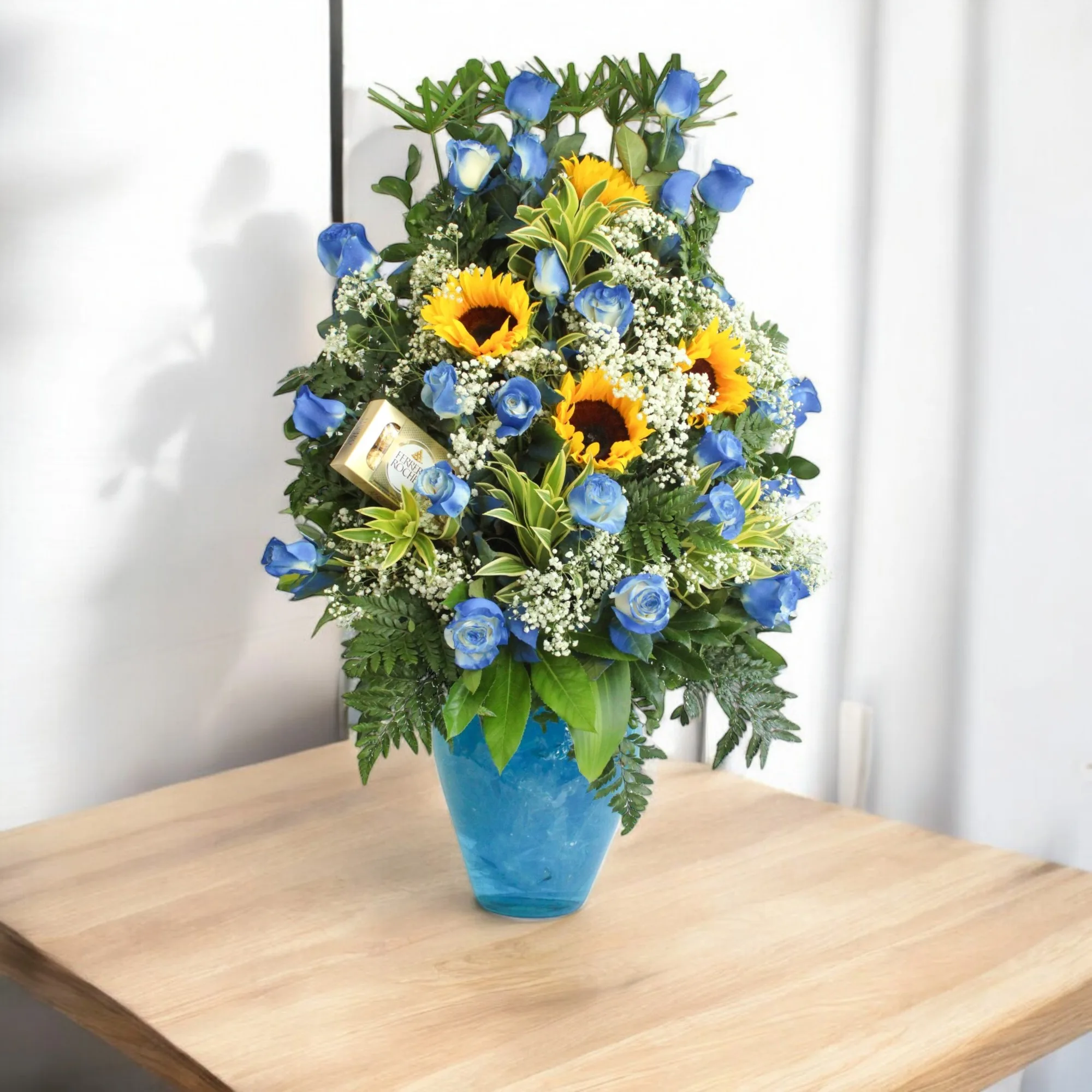Arreglo con Rosas azules, acompañadas de Girasoles, Gipsófilas, Rusgo, Canción de la India, Helecho Cuero, Papiros y chocolates Ferrero x8, en base de vidrio.