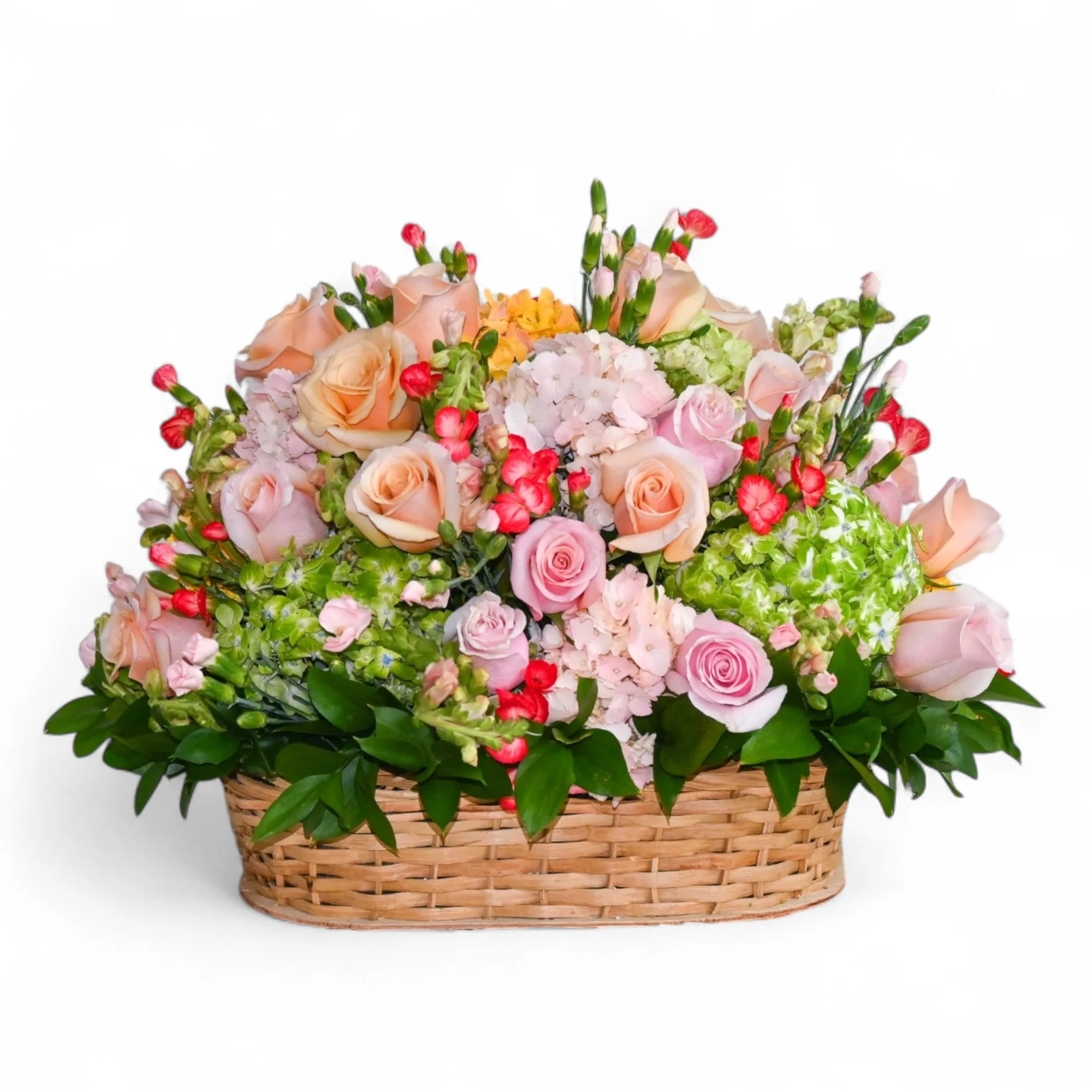 Las Hortensias, Rosas y Solomias se entrelazan con Boca de Dragón y Hojas De Dracena en una composición sofisticada y adorable.
