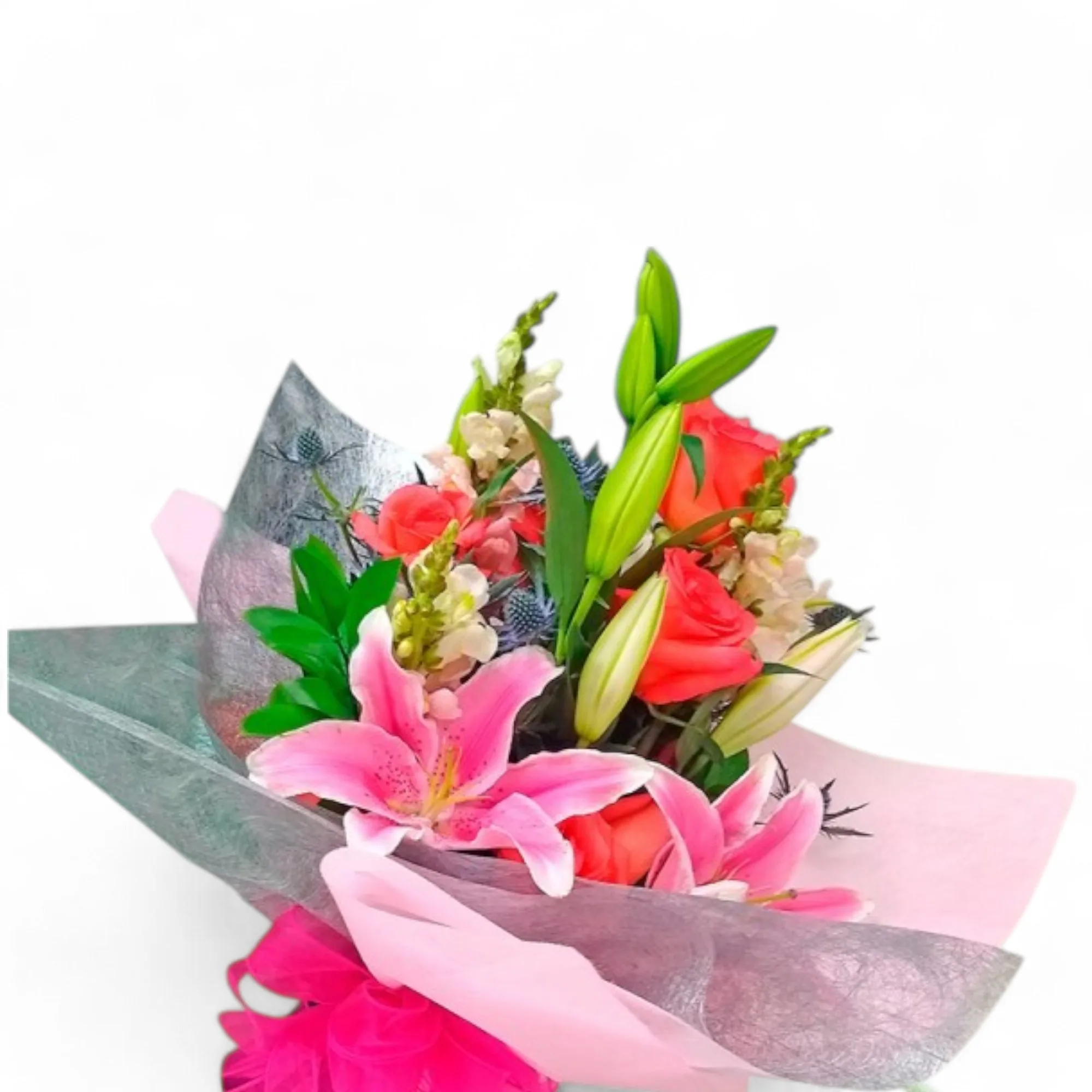 Elaborado en lirios, rosas, boca dragon y rusgo.