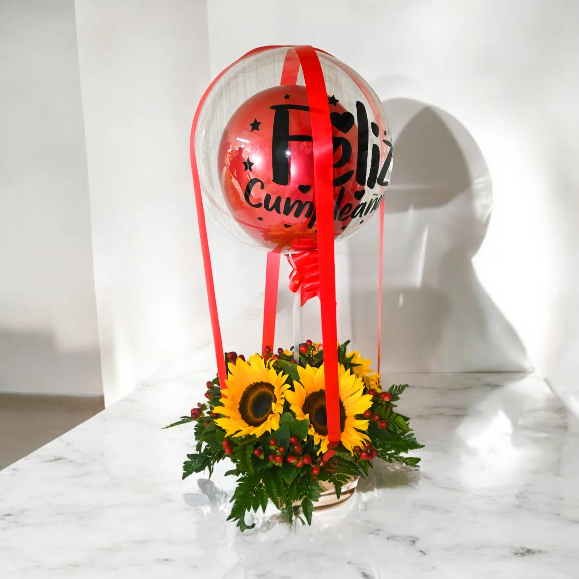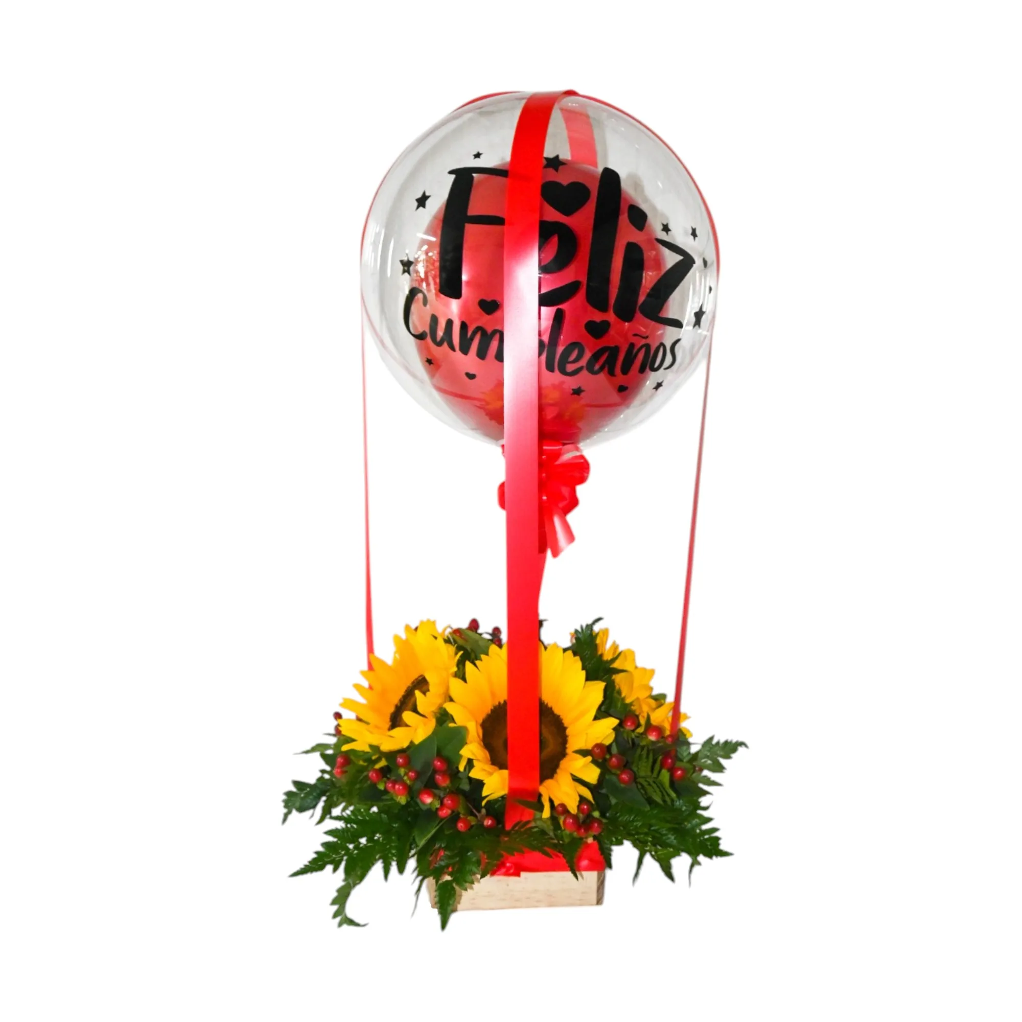 Arreglo elaborado en girasoles, follaje en rusgo, hipérico rojo, helecho cuero, globo marcado y lazo amarillo.