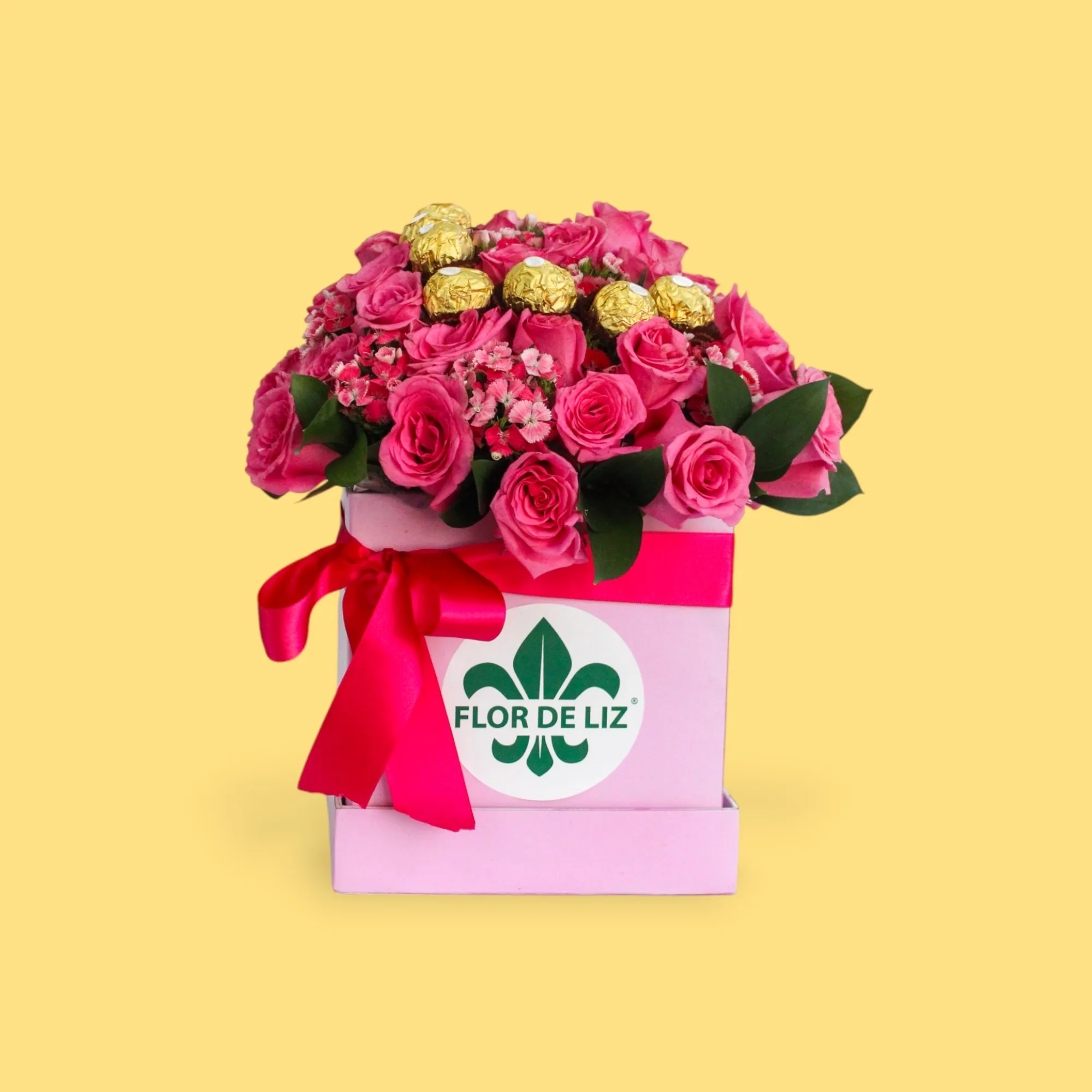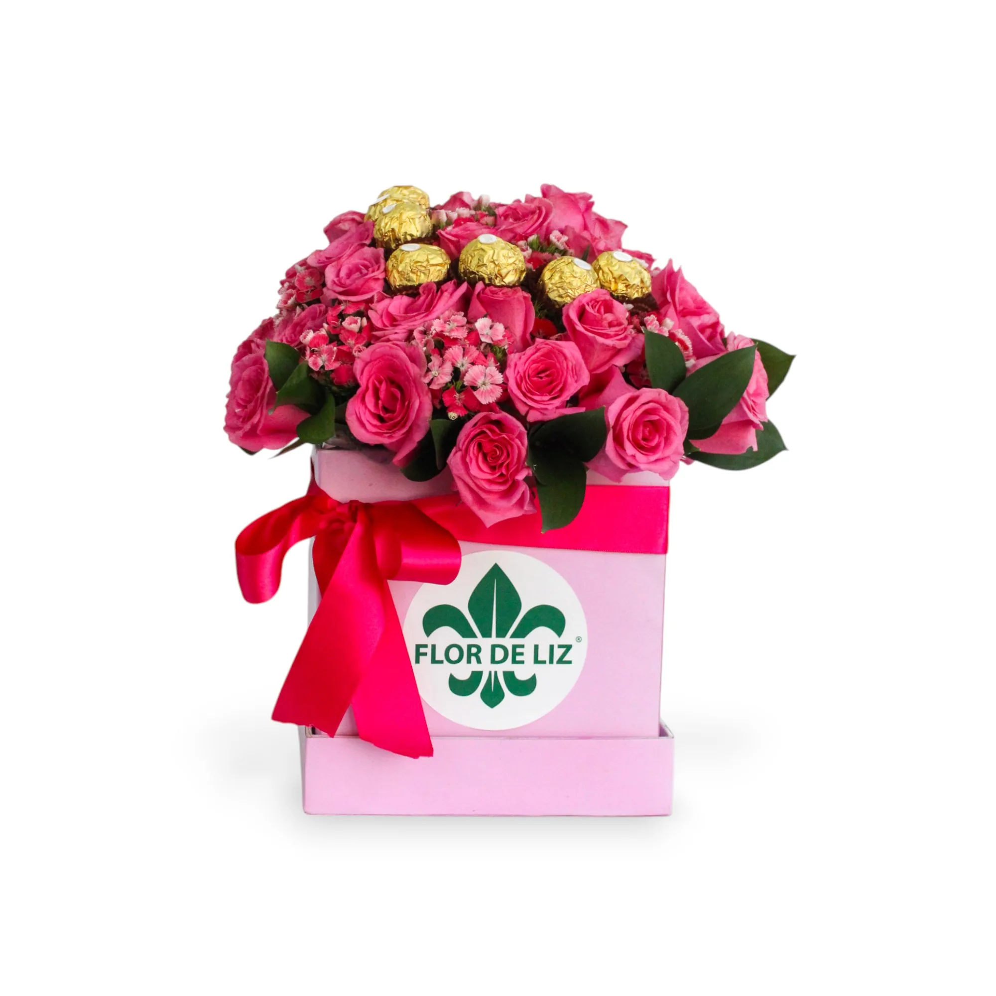 Caja decorada cuadrada elaborada con Rosas, Gypsophila rosada, Rusgo, 8 Chocolates Ferrero y lazo en cinta de tela.