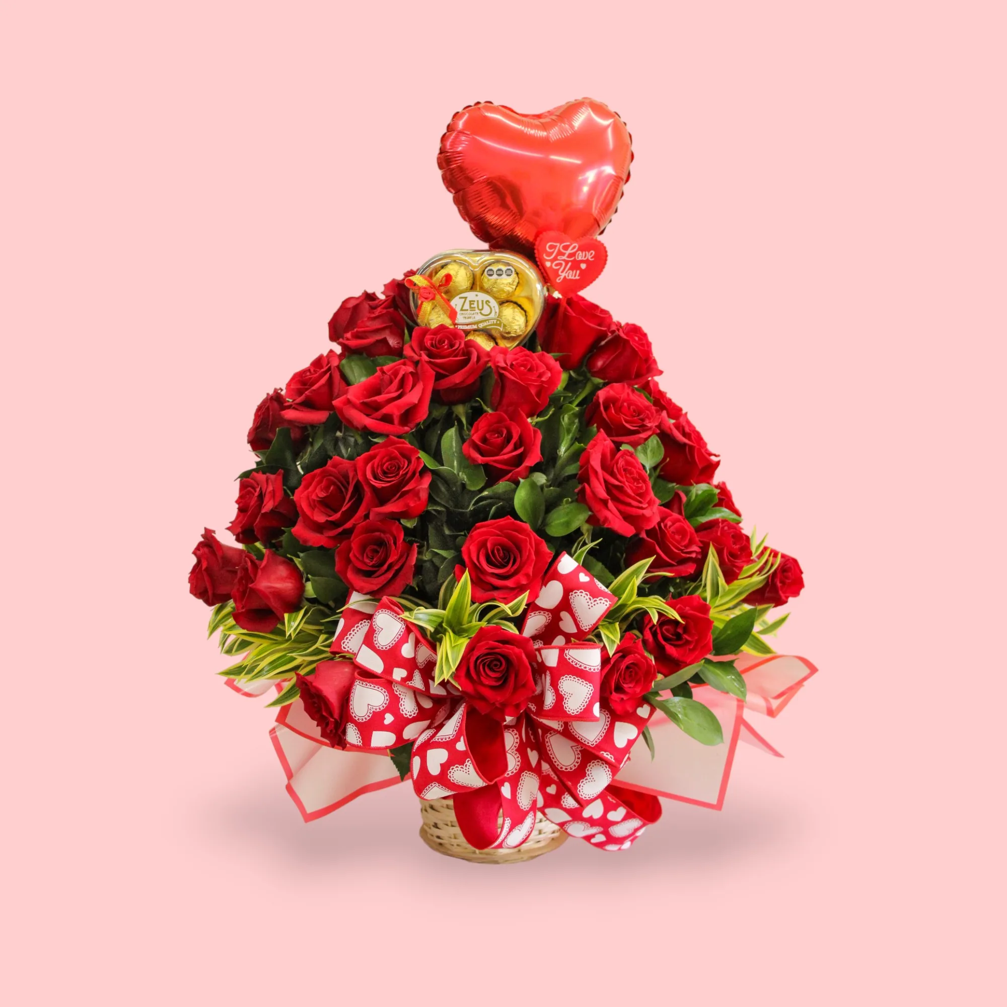 Hermoso arreglo con Rosas rojas, Canción de la India, Rusgo, acompañado de chocolates Zeus, globo, papel coreano y lazo de cinta estampada en base de canasta.