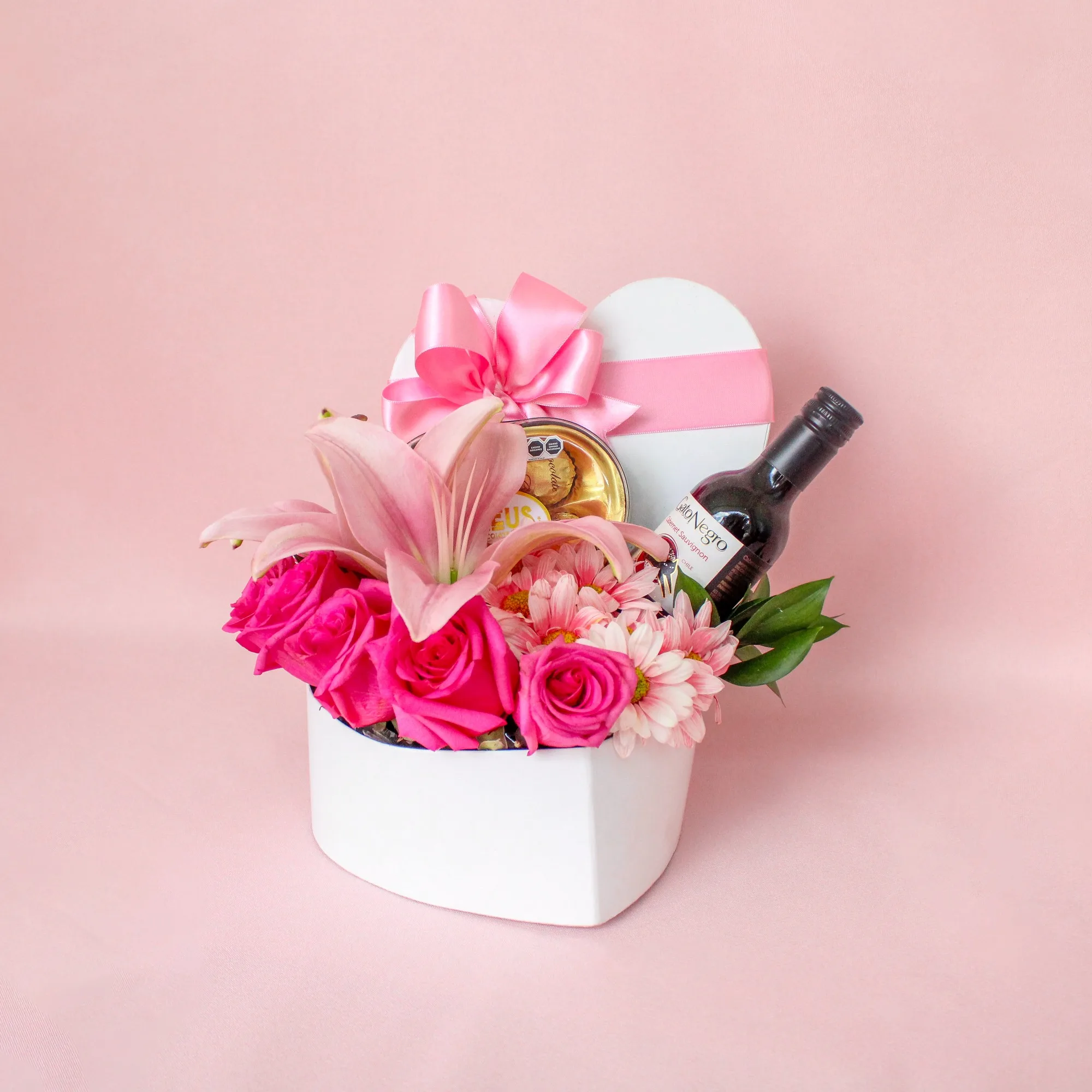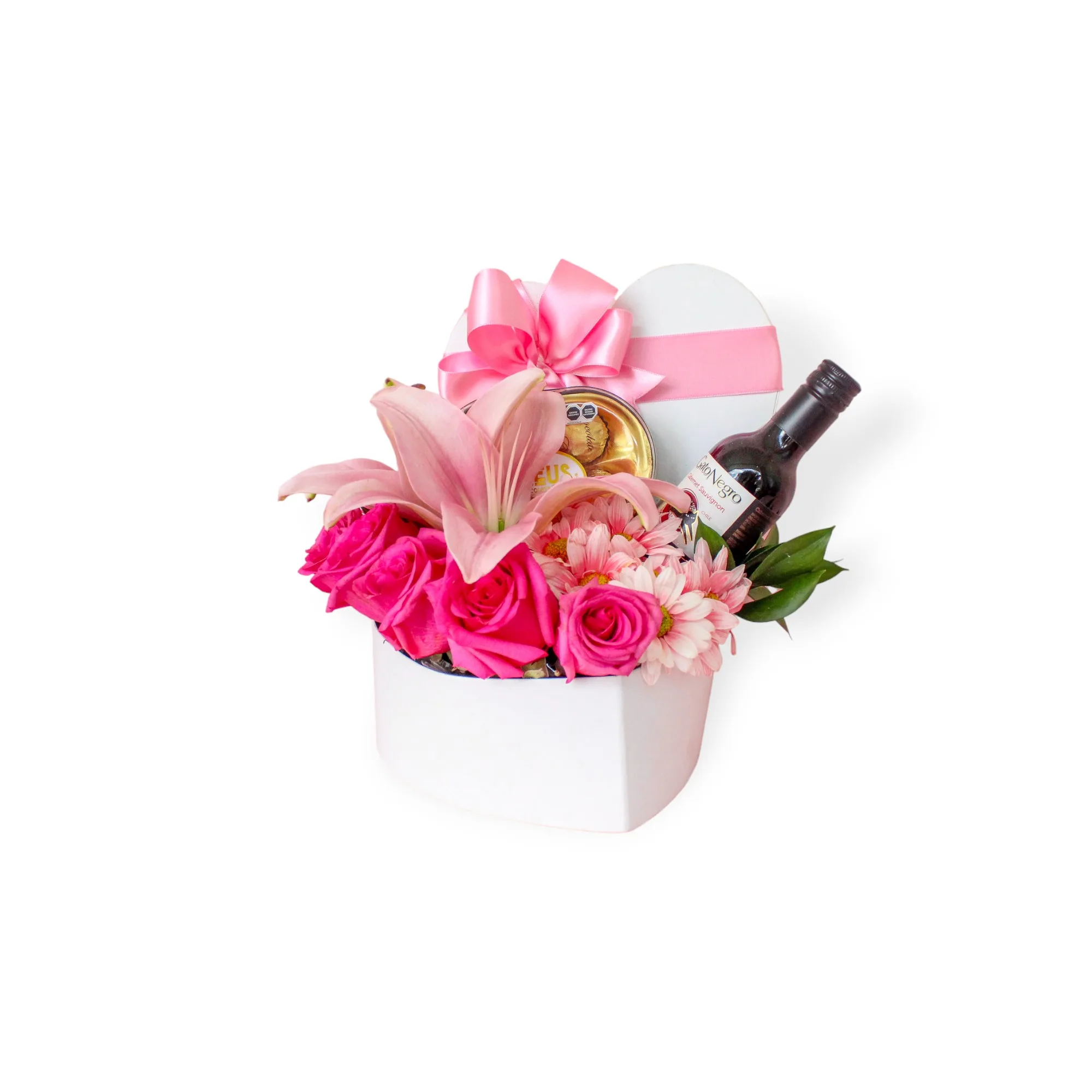 Esta hermosa caja en forma de corazón, con rosas, margaritas, lirio, rusgo, chocolates Zeus y un pequeño vino, es el detalle perfecto para enamorar.
