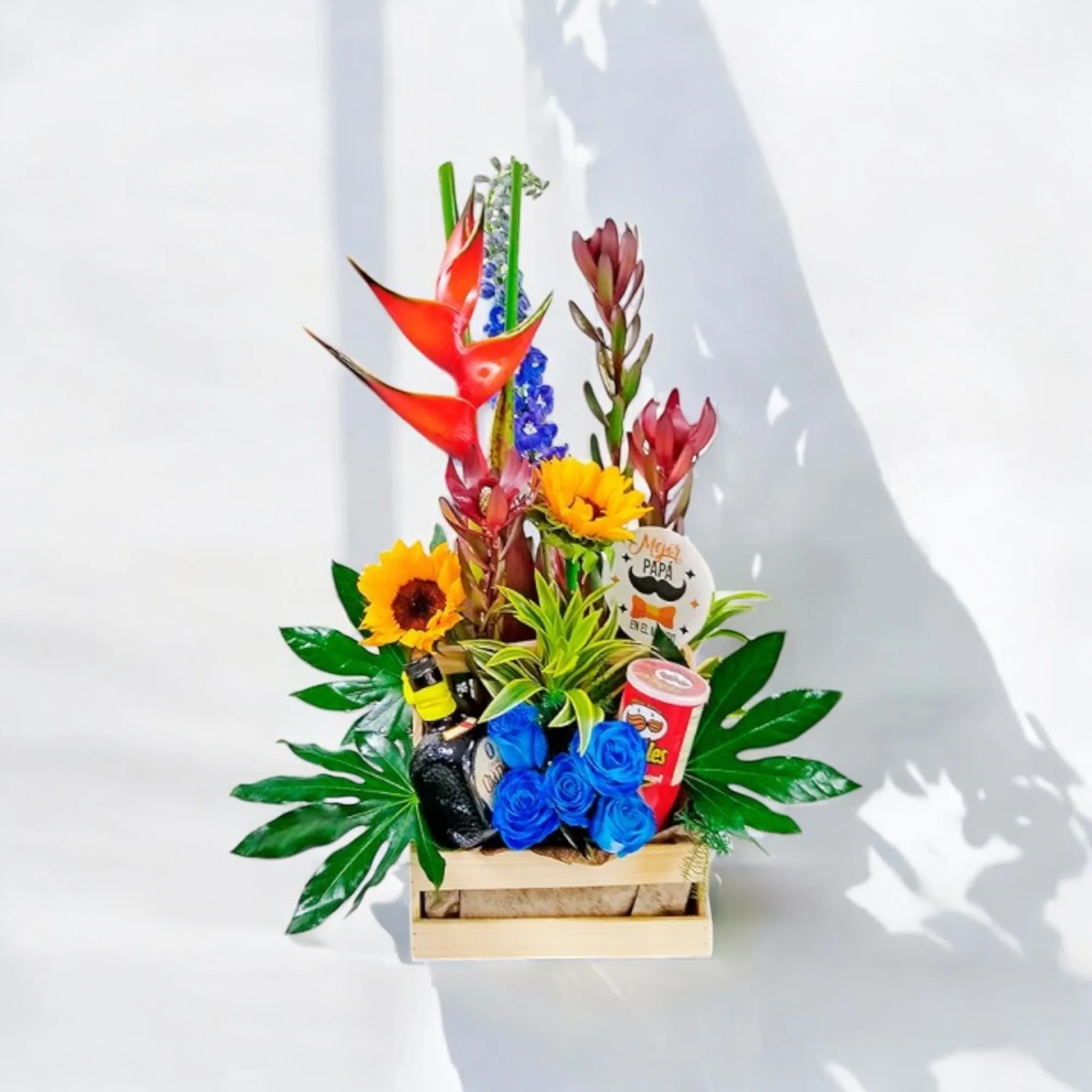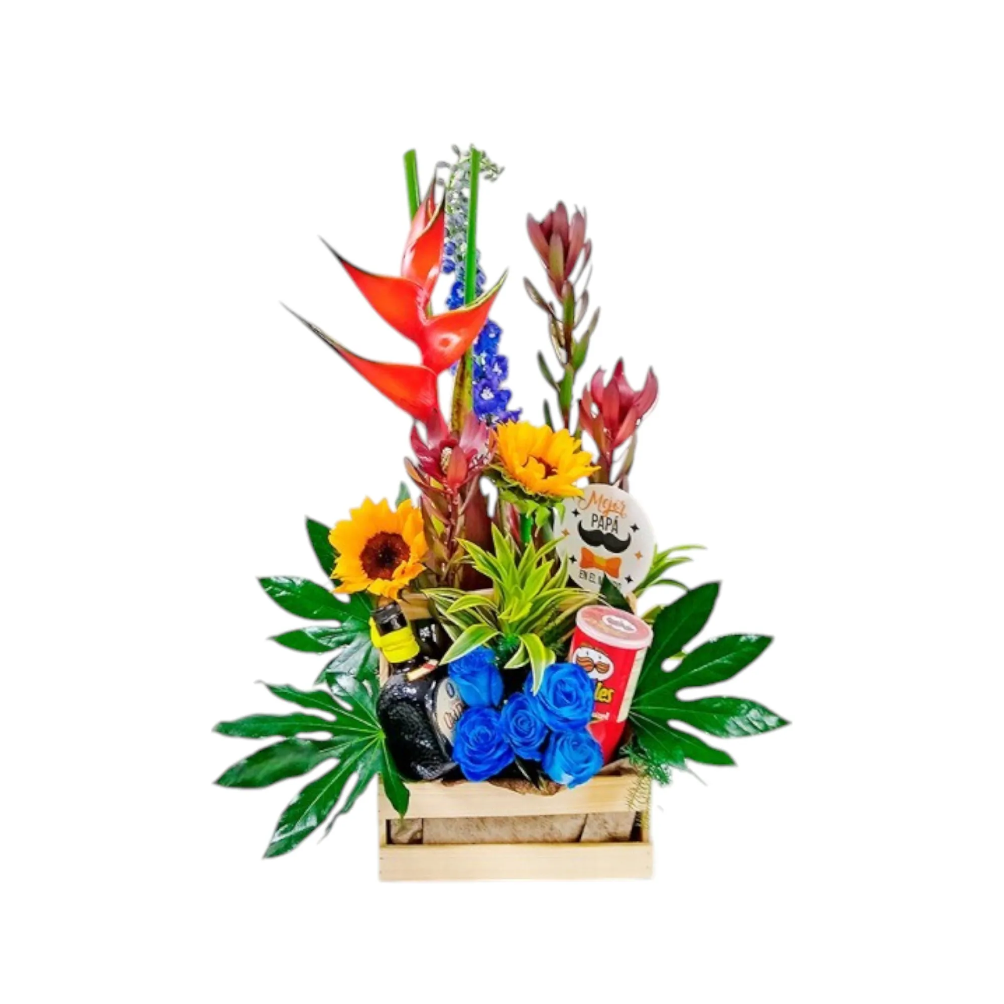 Arreglo en 1 heliconia, canción de la india, galateas, botella pequeña de Old Parr, papas pringles, manito de dios, 5 rosas y topper papá.