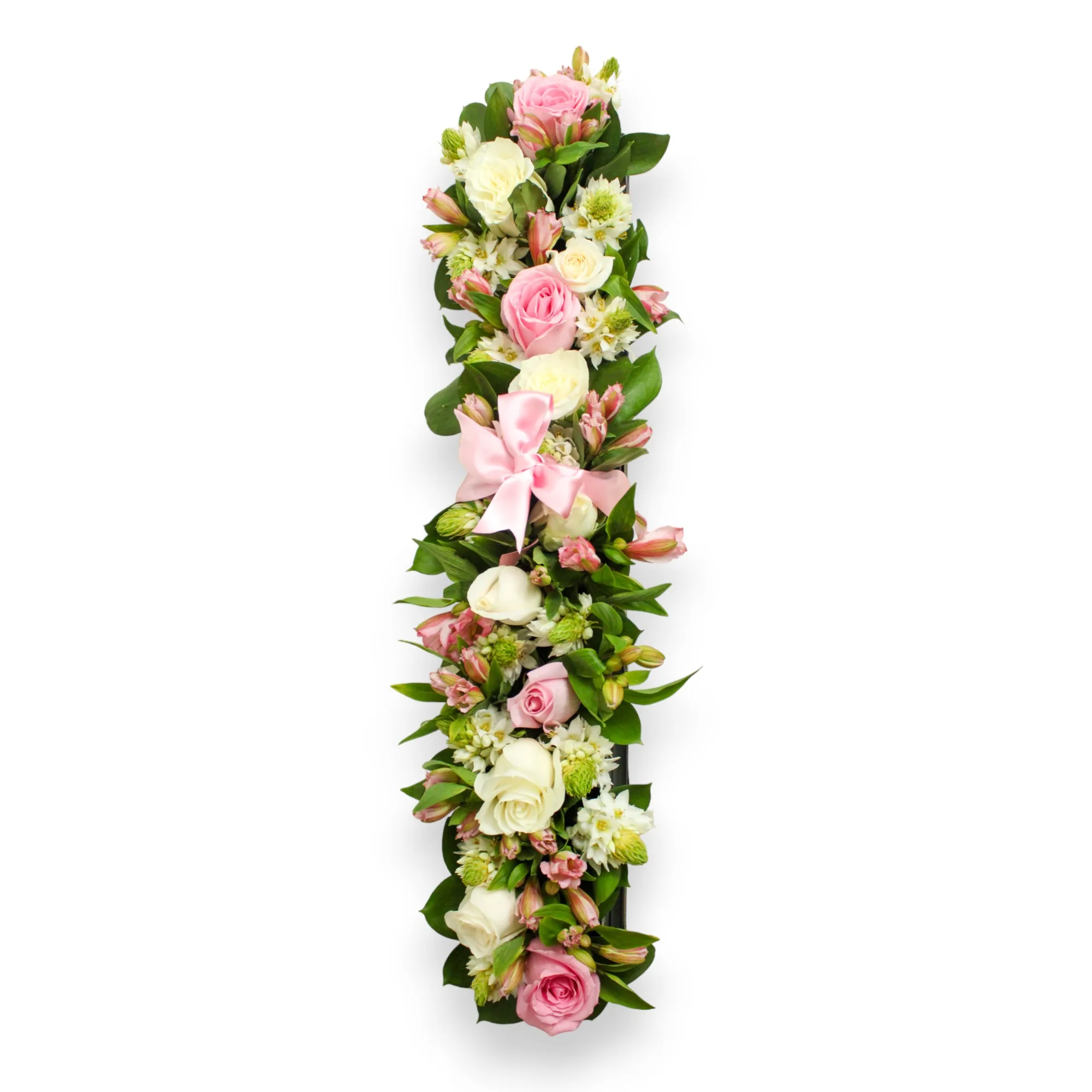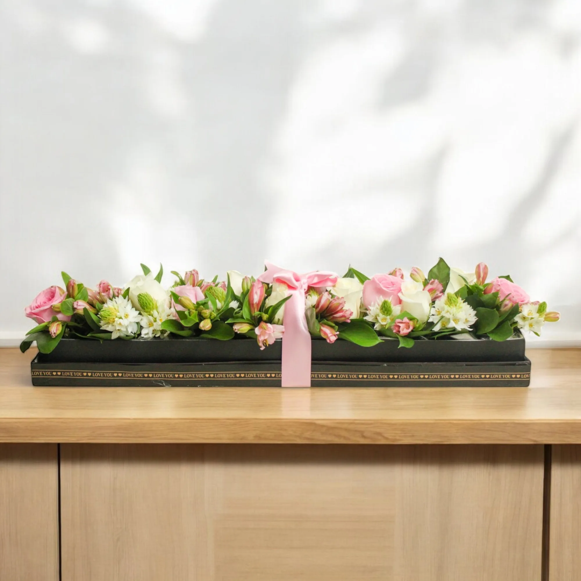 Esta hermosa caja decorada con rosas surtidas, astromelias, estrellas de Belén y rusgo es perfecta para sorprender con un detalle único.