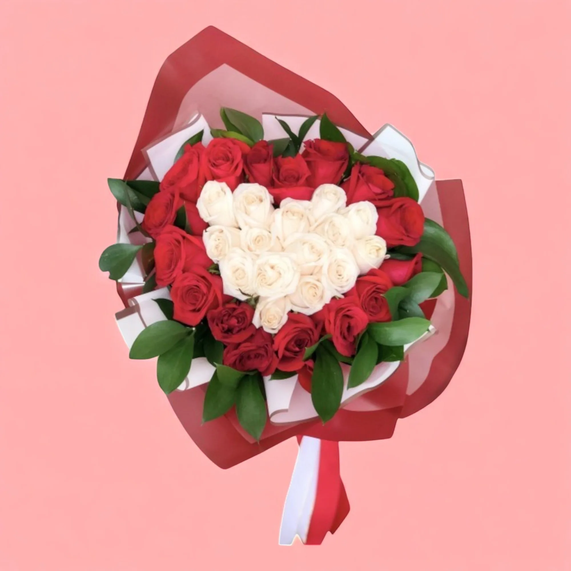 Diseño en rosas rojas y rosas blancas, follaje en rusco, papel de seda color rojo y blanco y lazo. (Envoltura sujeta a cambio según disponibilidad).