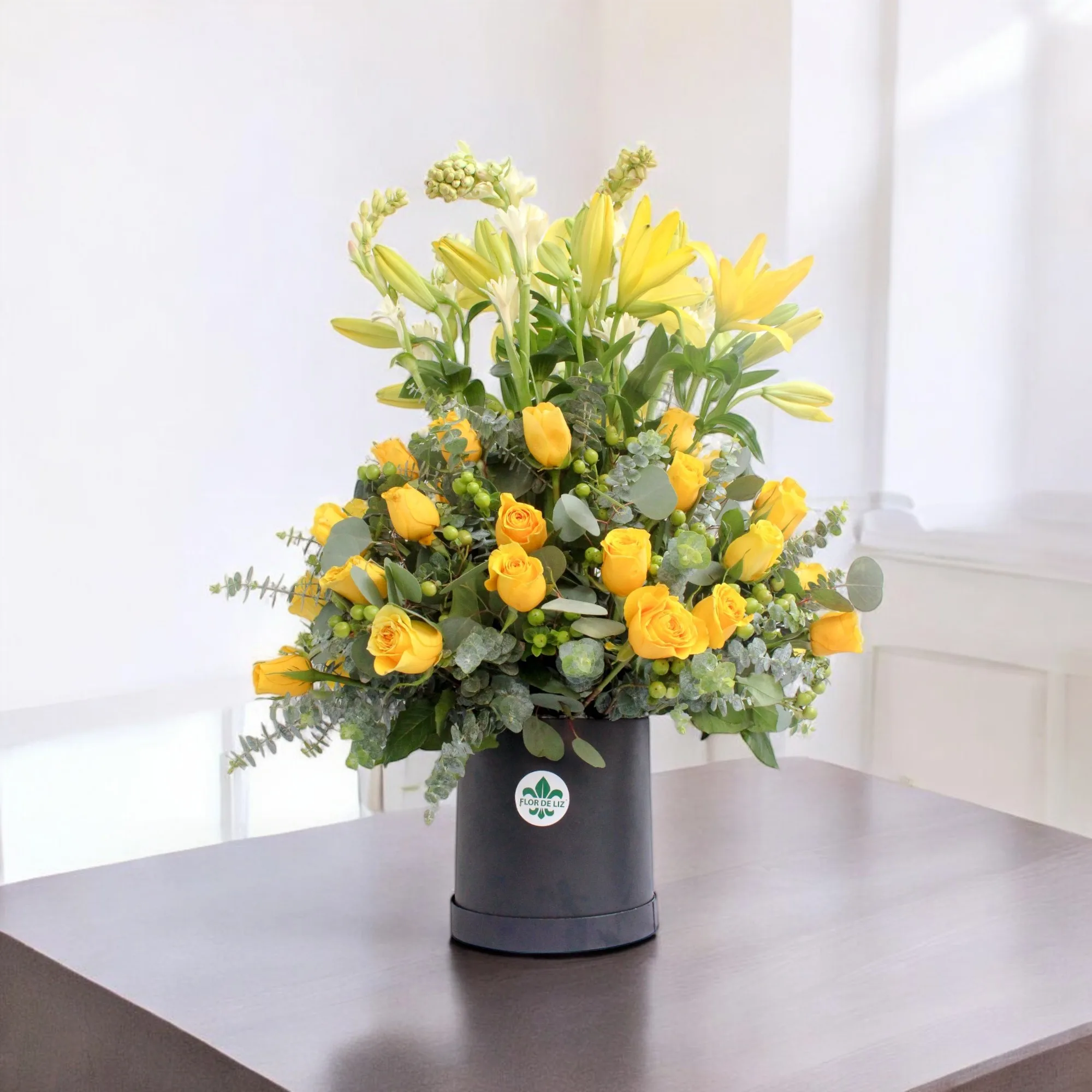 Hermosa caja decorada redonda elaborada con rosas amarillas, boca de dragon, lirios amarillos, eucalipto y cafeto. *base sujeta a cambio segun disponibilidad