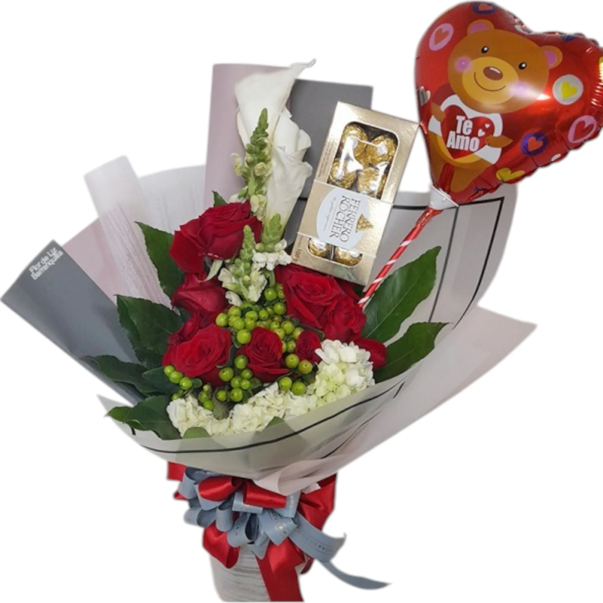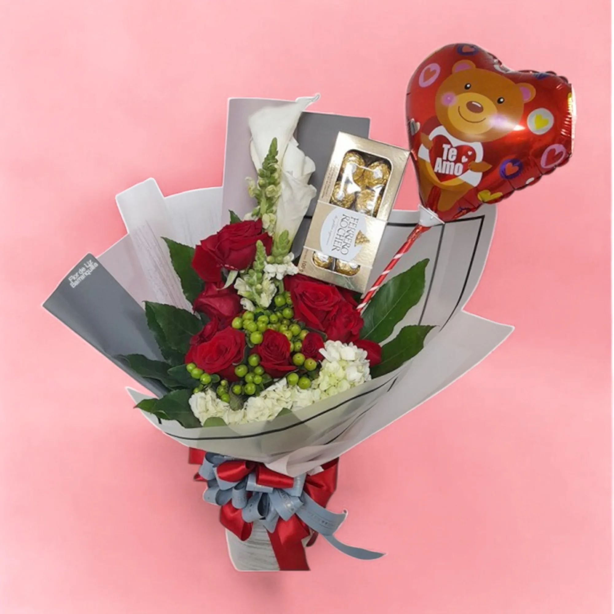 Ramillete elaborado en rosas rojas, hortensias blancas y cartuchos blancos acompañado de follaje en cafeto verde, boca dragón y manito de Dios. Globo pequeño, chocolates ferrero x8 y envoltura en papel y lazo fino.