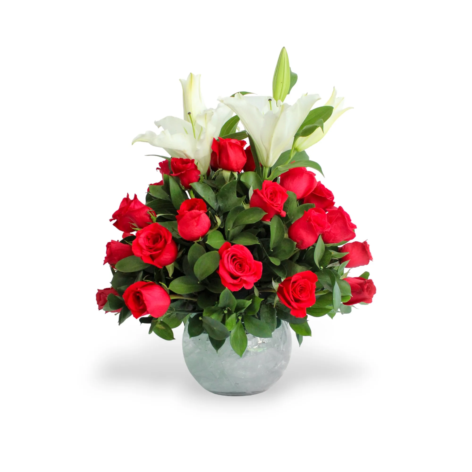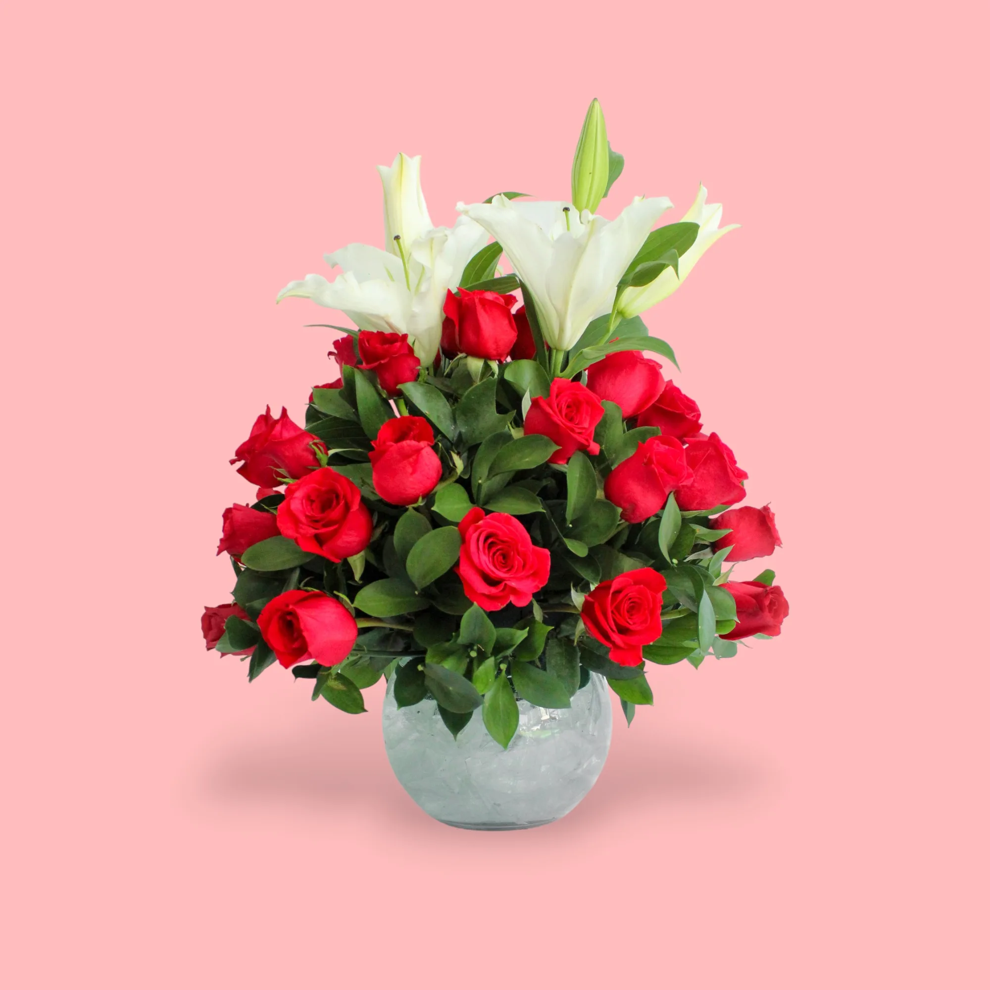 Arreglo redondo en rosas y lirios entrelazados con follaje en rusgo, creando una armonía visual elegante y delicada.Perfecto para ocasiones especiales o para dar un toque único a tus espacios.