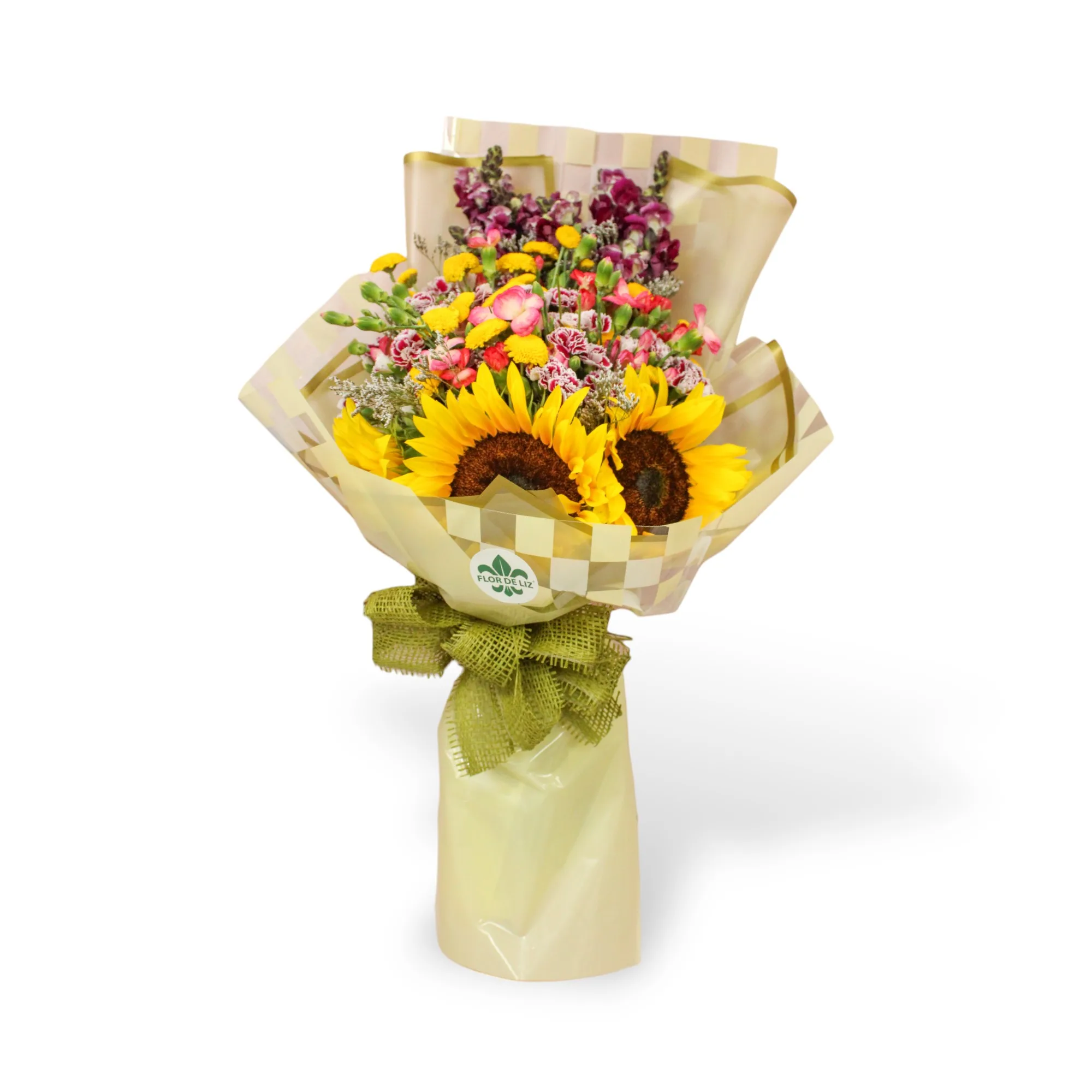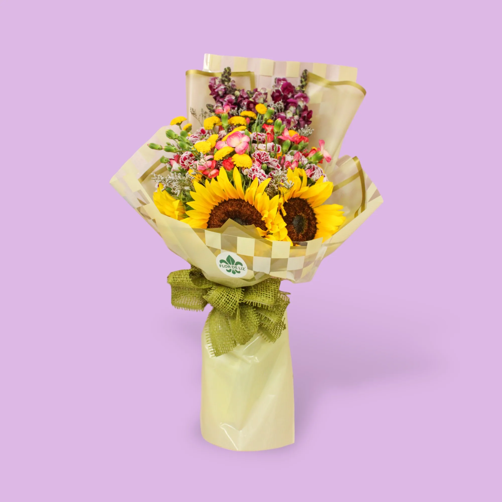 Hermoso ramillete elaborado con girasoles, pinoquio amarillo, boca de dragón morado, solo mío rosados, rafines, caspia, envuelto en papel coreano y adornado con un lazo en cinta de malla.