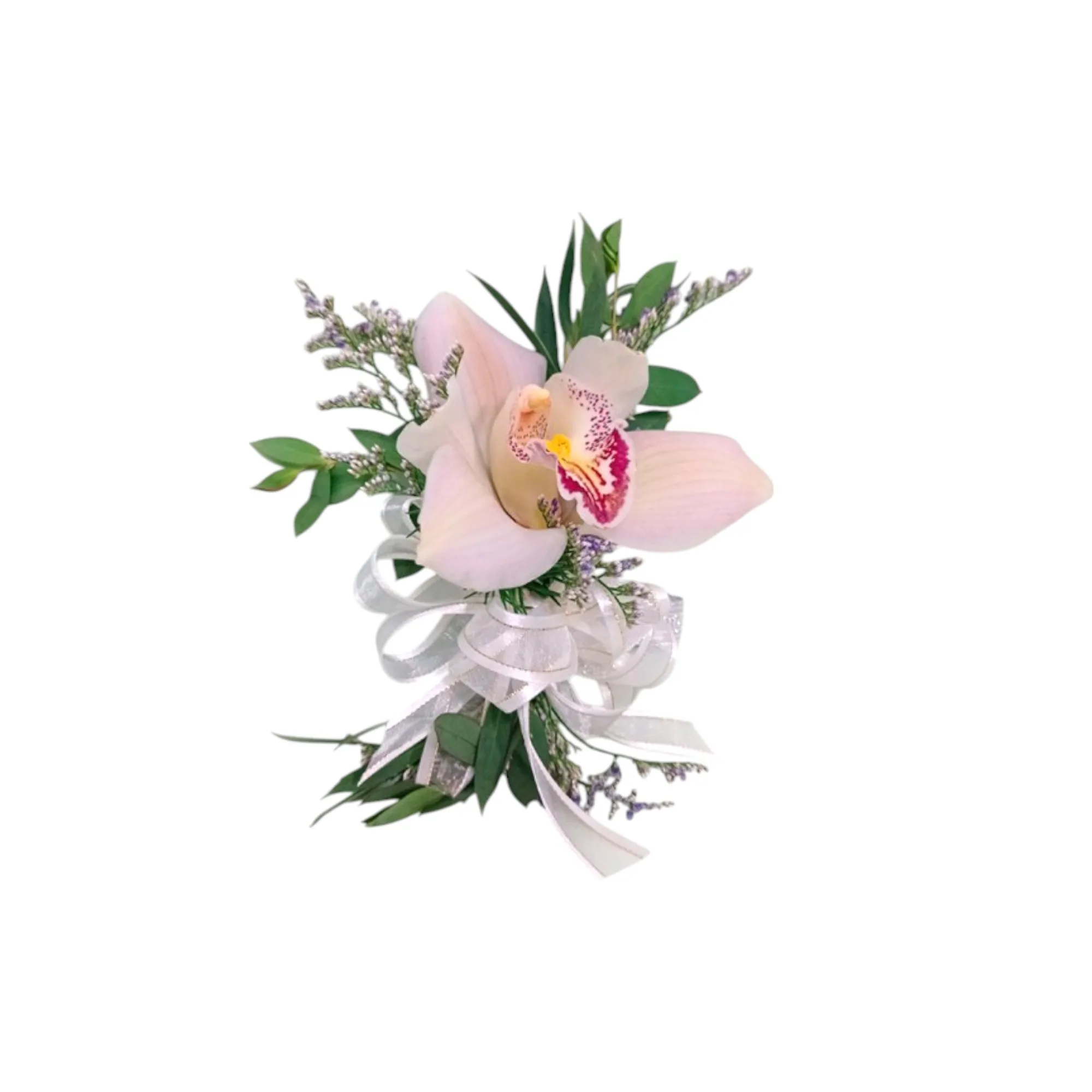 Brazalete elaborado en una orquídea con follaje en eucalipto y caspia.