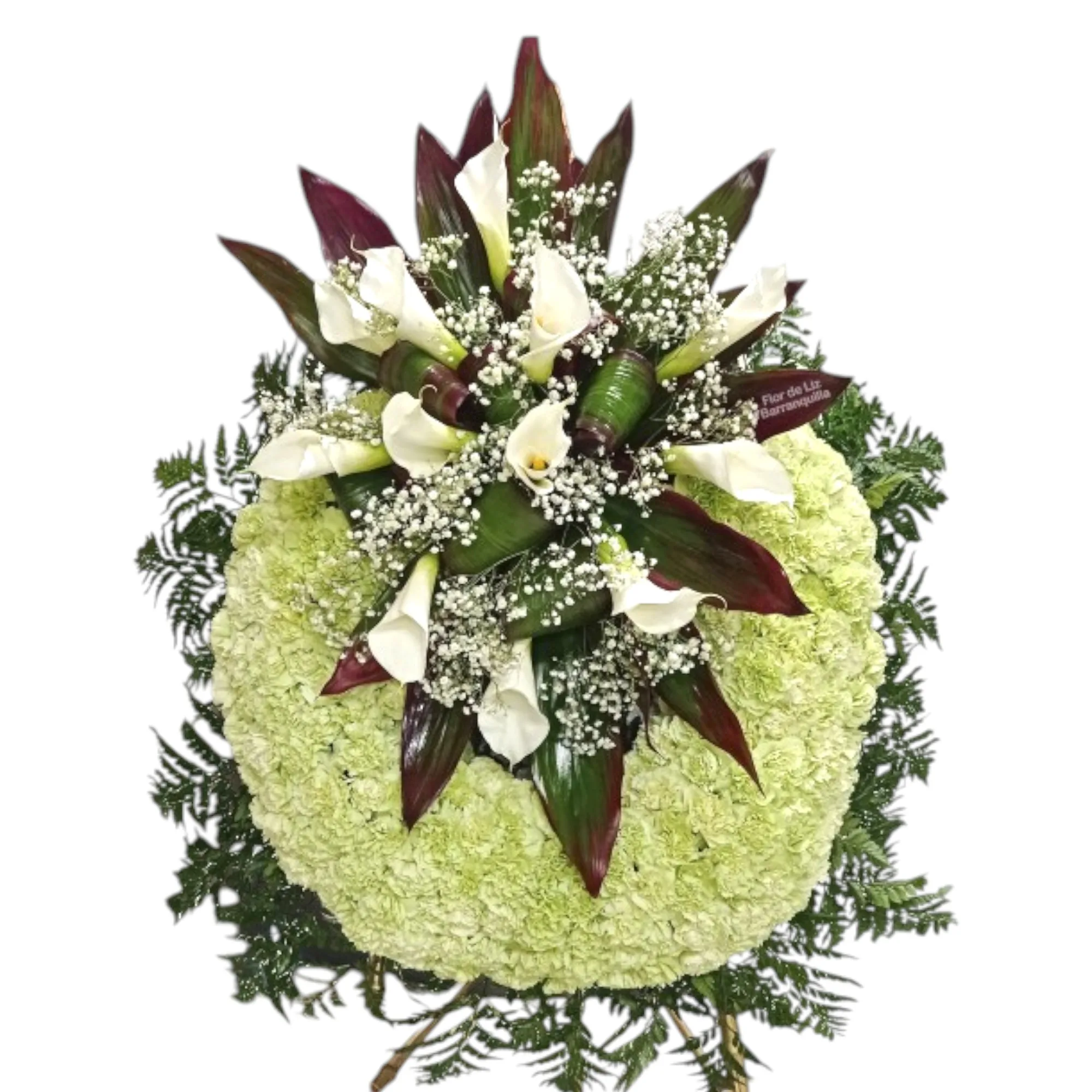 Corona elaborada en claveles verdes y aplique en cartuchos con gipsophila, Follaje en hoja de carey y helecho cuero.