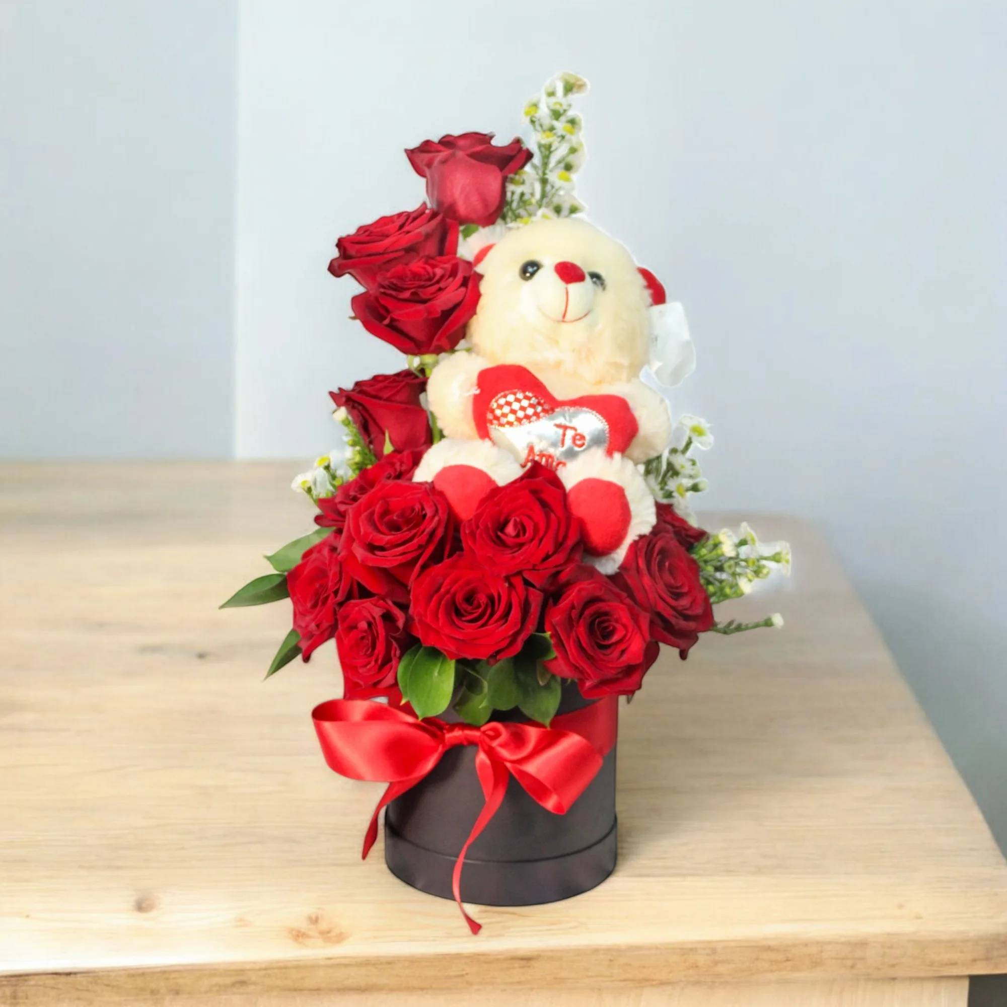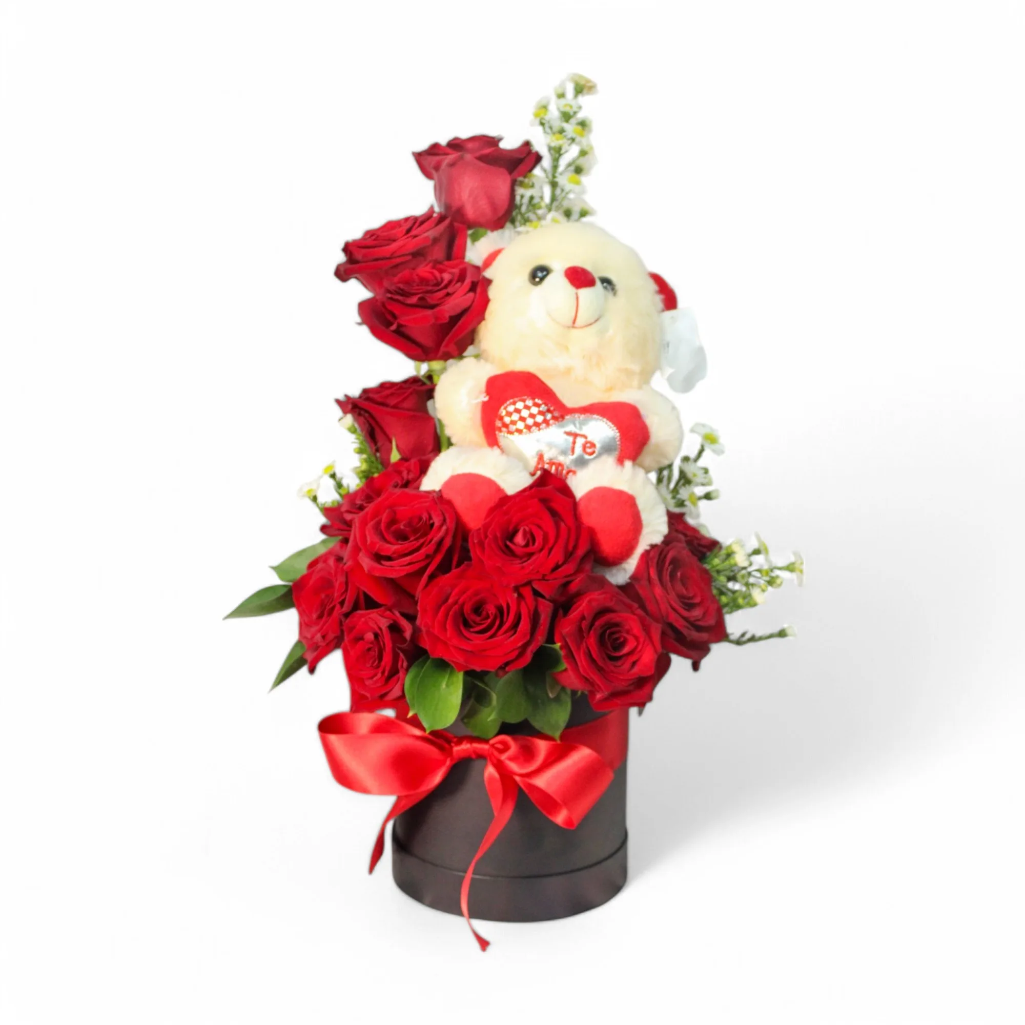 Esta delicada caja redonda con rosas, aster y un toque de rusgo es el detalle perfecto para sorprender.
