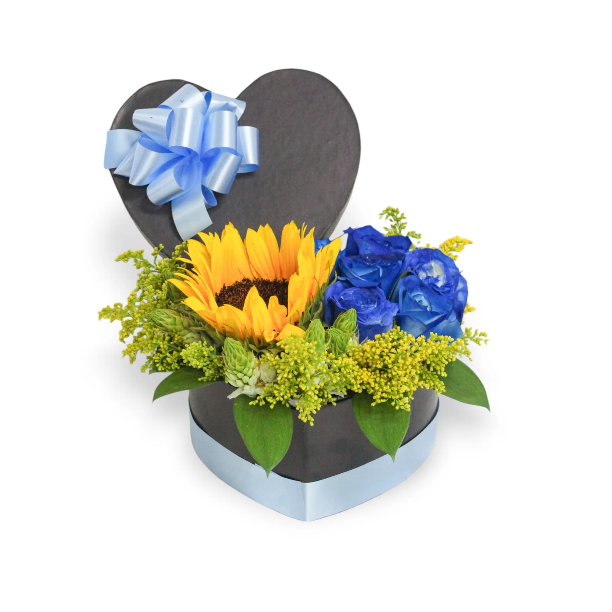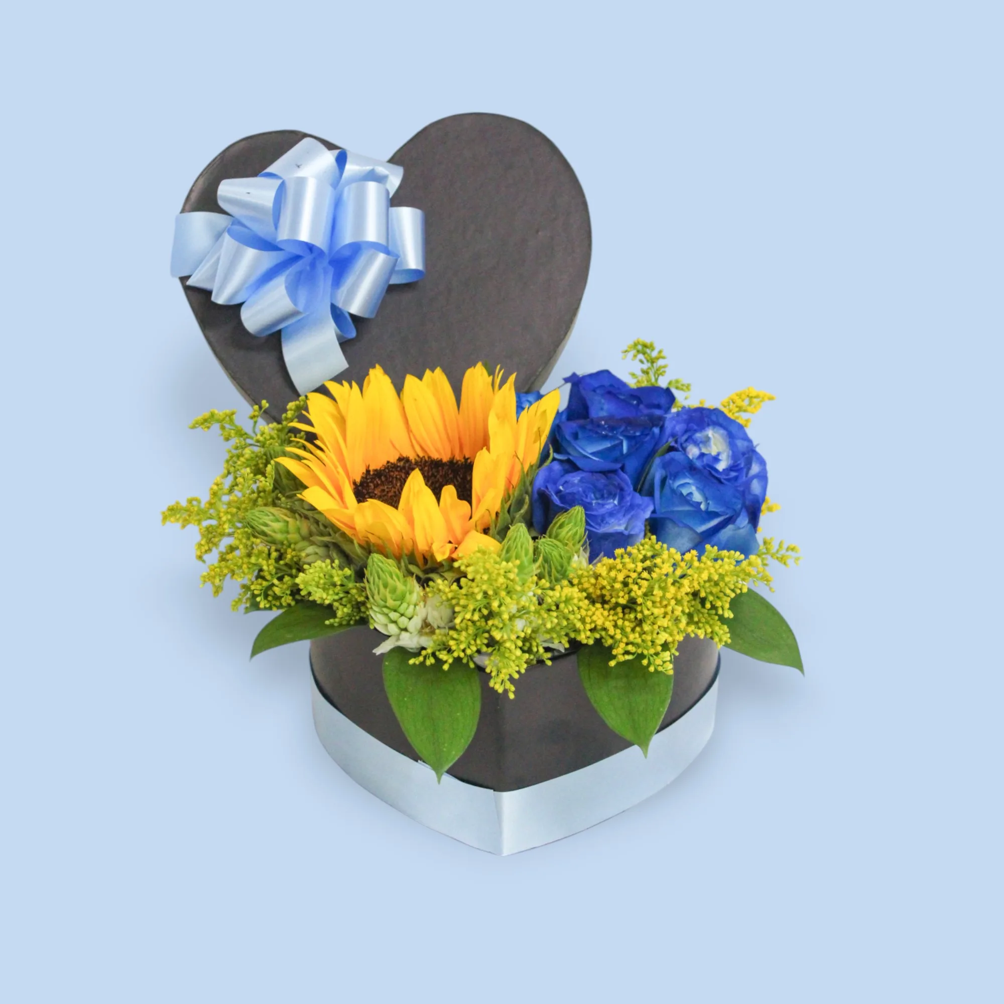 Hermosa caja decorada en forma de corazón, elaborada con rosas azules, girasol, estrella de Belén, soliaster, rusgo y lazo en cinta de papel.