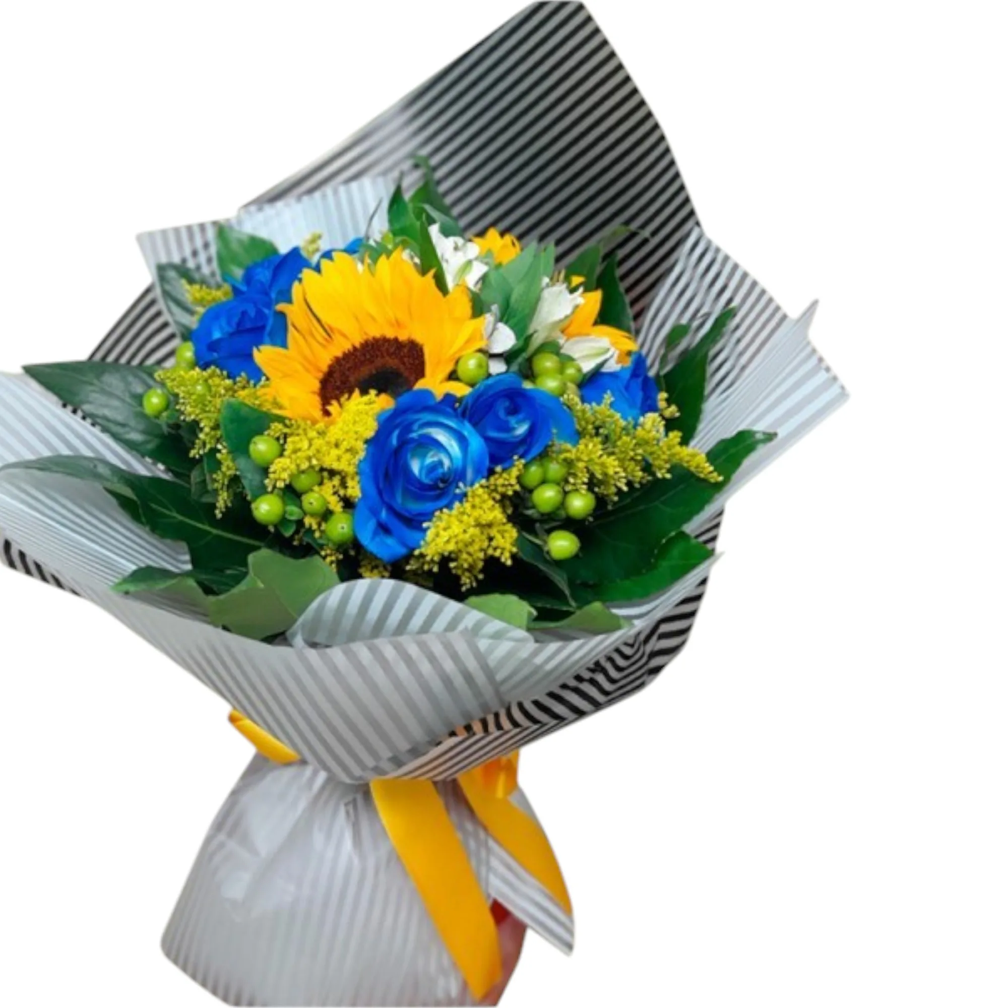Ramillete elaborado en rosas azules, girasoles, astromelia acompañado de follaje en solidaster, cafeto verde y hojas manito de dios. Envoltura en papeles finos.