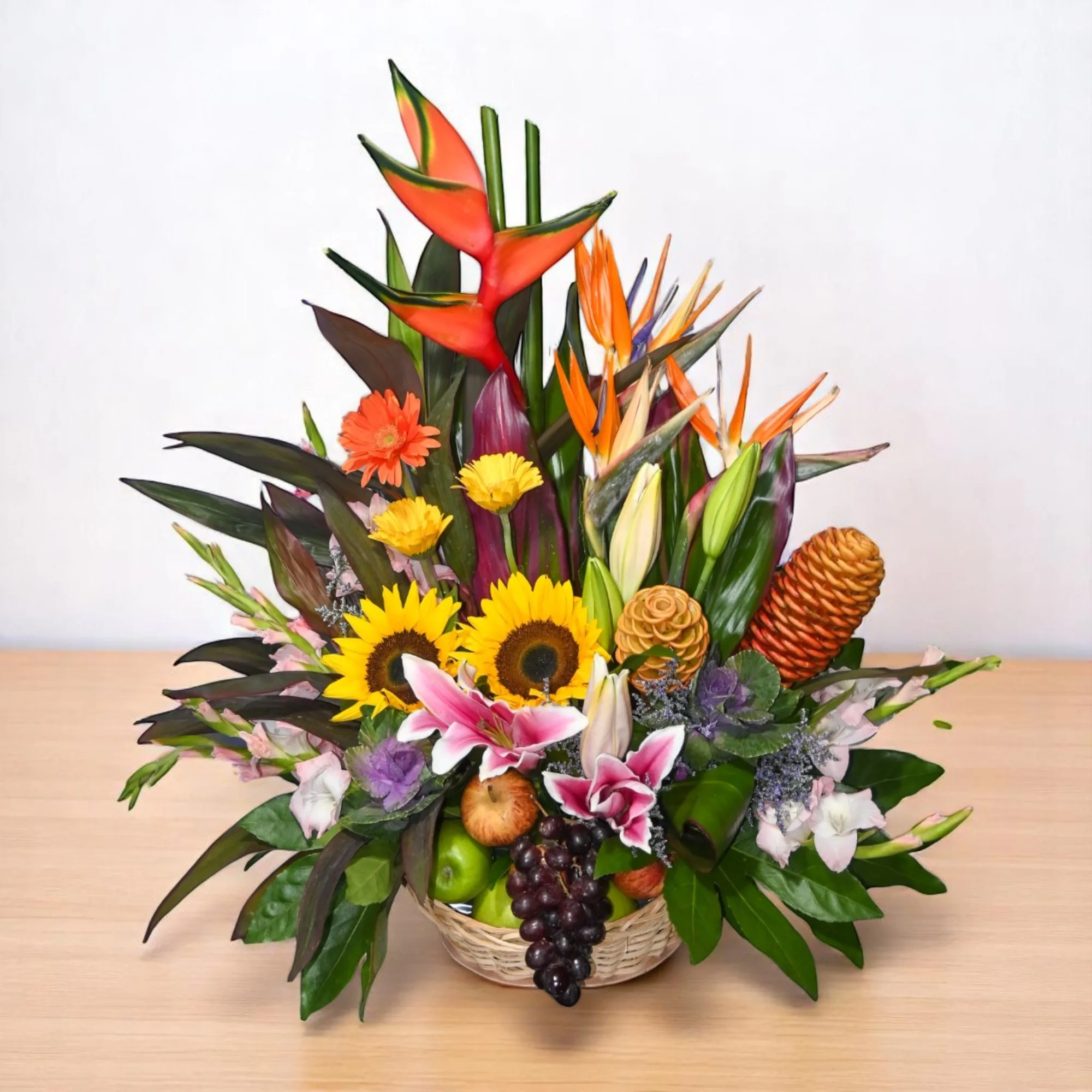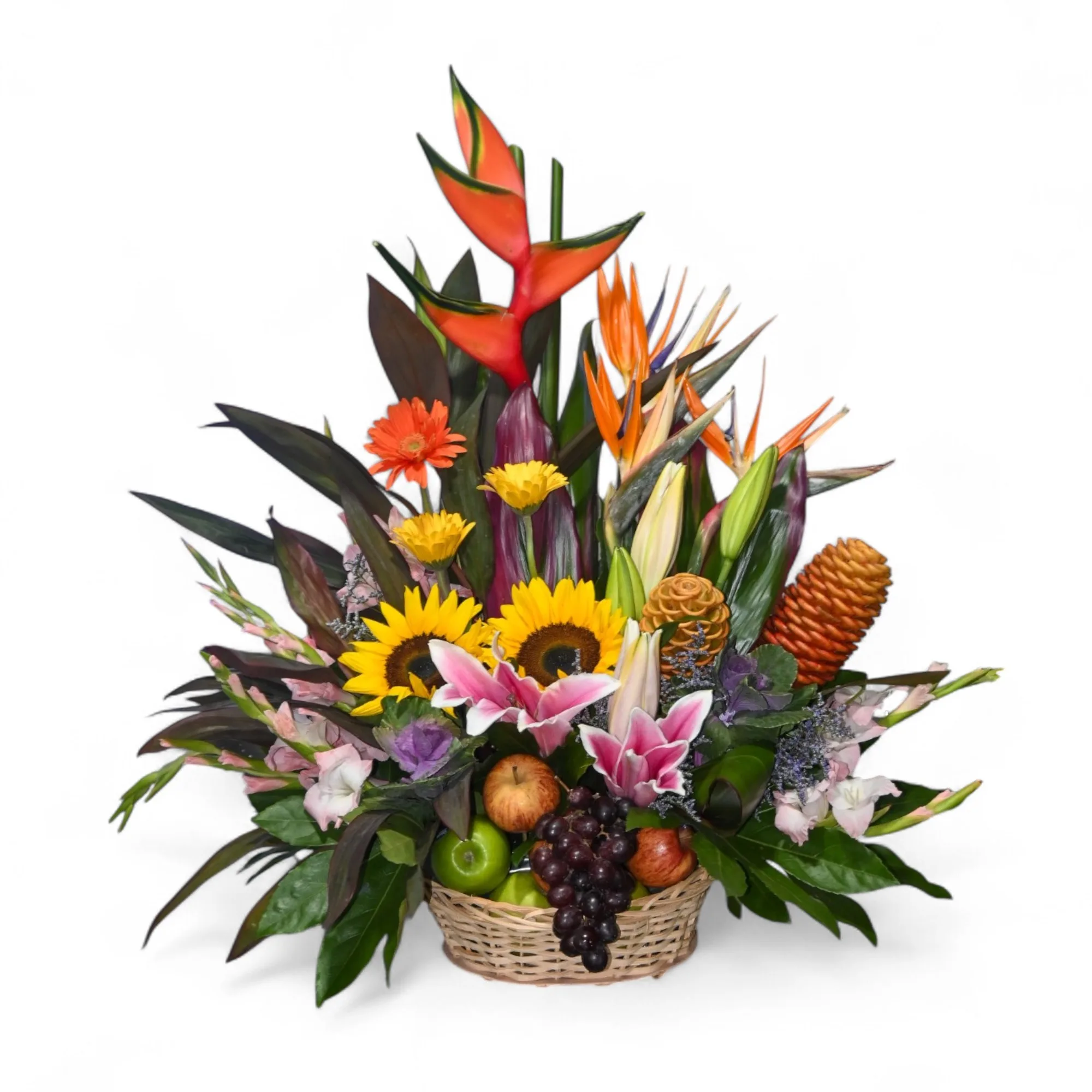 Arreglo elaborado en combinación de girasoles, gerberas, maracas, hoja de carey, heliconias, ave del paraíso, gladiolos y lirios, acompañado de un toque tropical con frutas frescas. Todo dispuesto en una base tipo canasto que realza su presencia imponente y colorida.