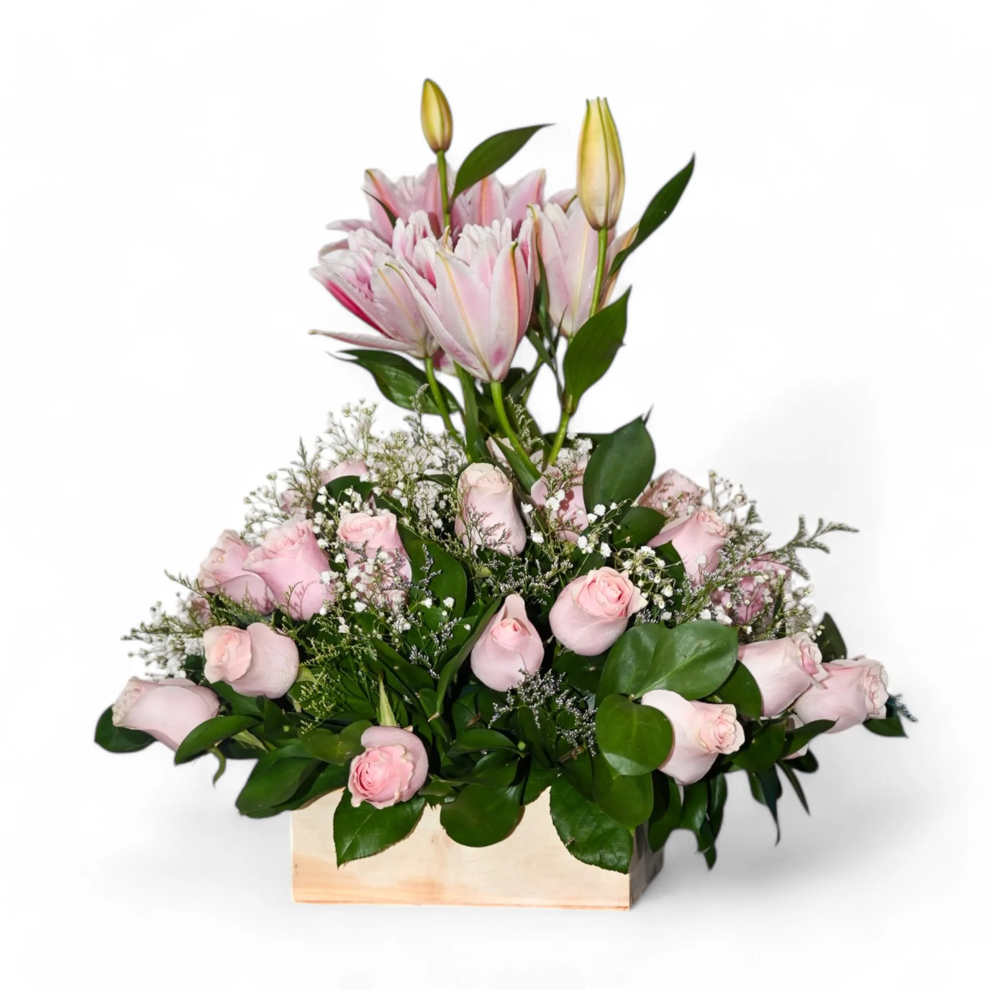Arreglo en base de madera elaborado en rosas rosadas, lirios, gypsophilia y caspia.