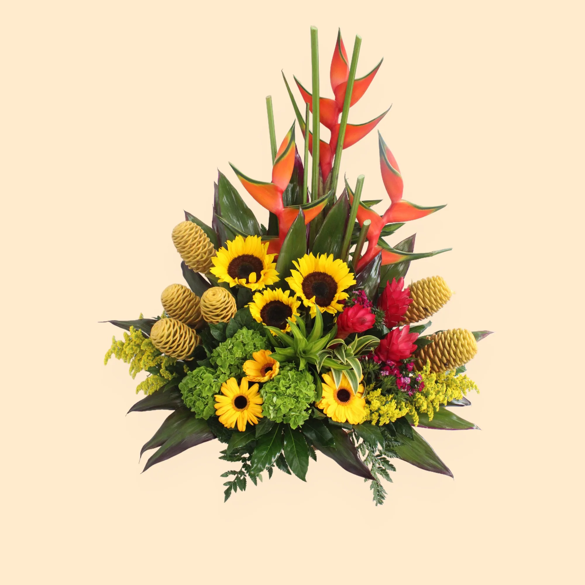 Arreglo en heliconias, girasoles, gerberas, ginger, maracas, hoja de carey, helecho cuero, hoja dracena, hortensias, base en canasto.