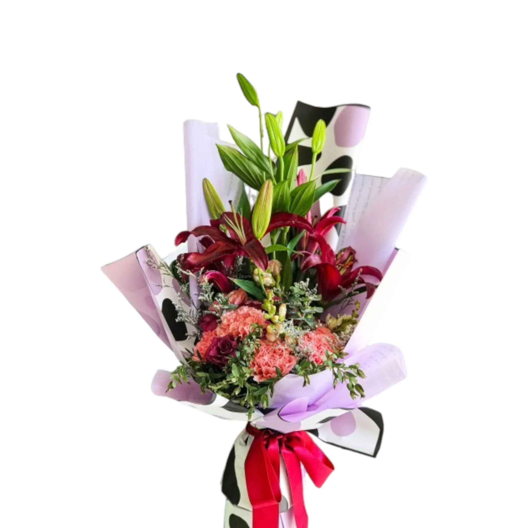Hermoso Ramillete elaborado en lirios, boca de dragón, eucalipto, hortensias y caspia.