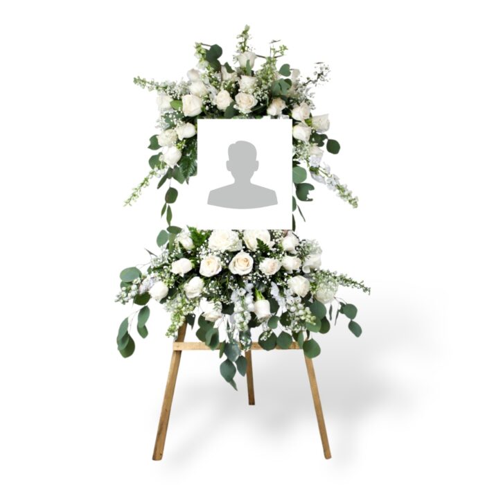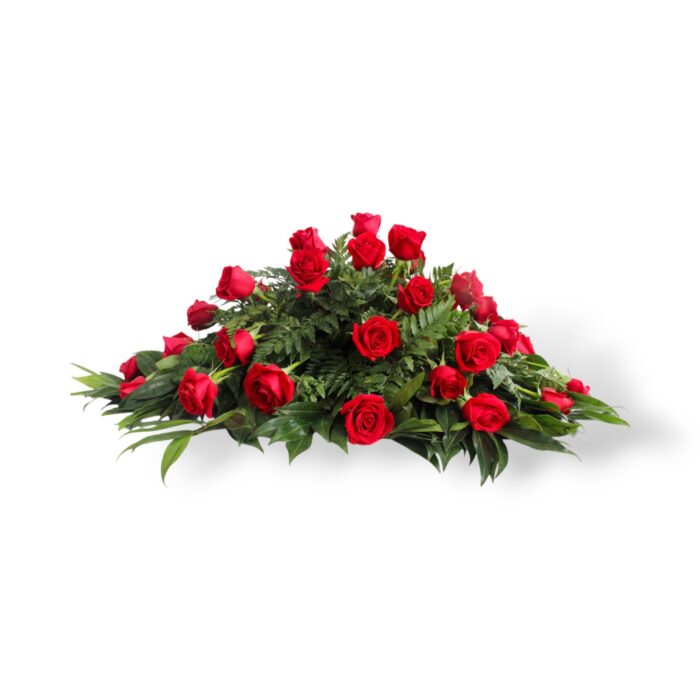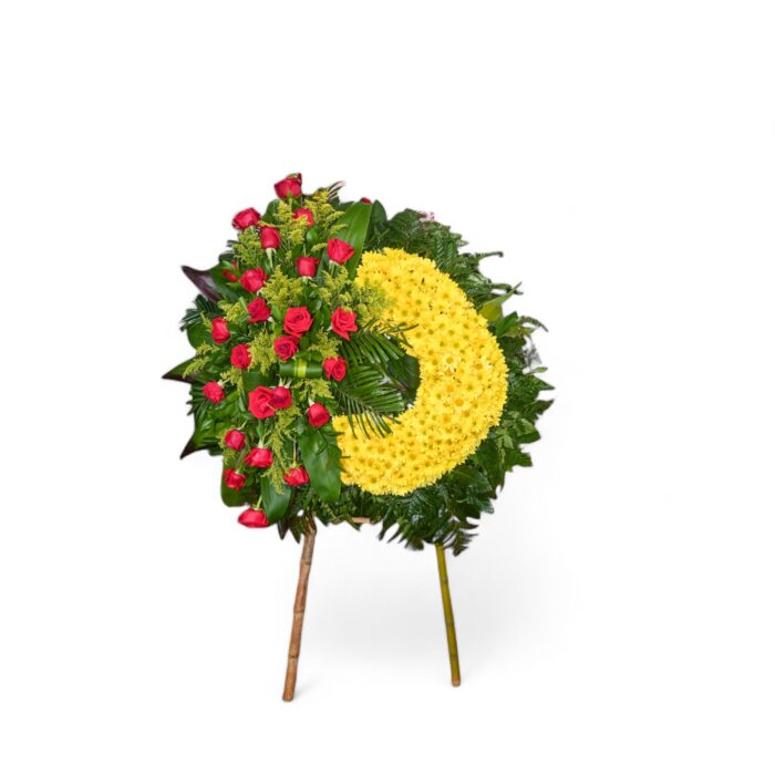 Corona elaborada en spaider, helecho cuero, aplique en rosas rojas, gipsofilia y hoja de lino.