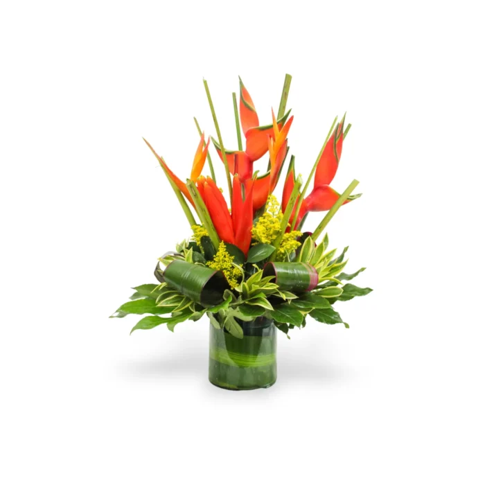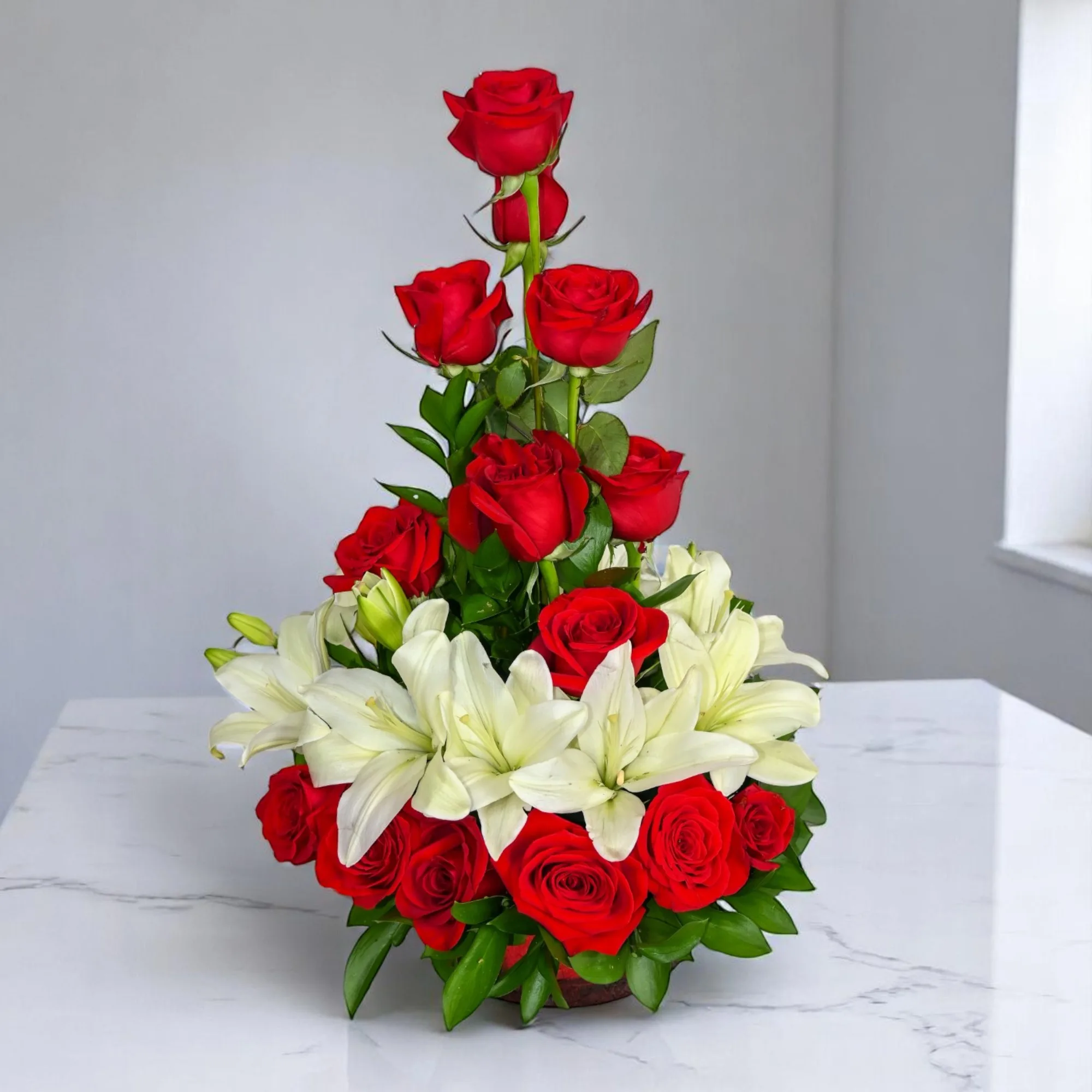 Elegante arreglo con rosas, lirios y rusgo en base de vidrio.