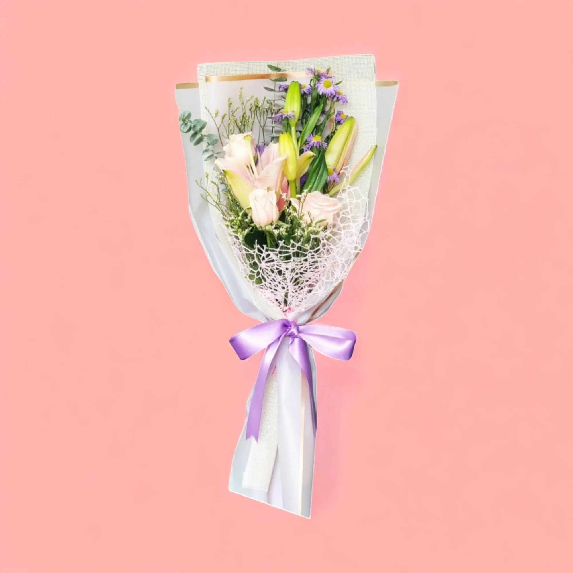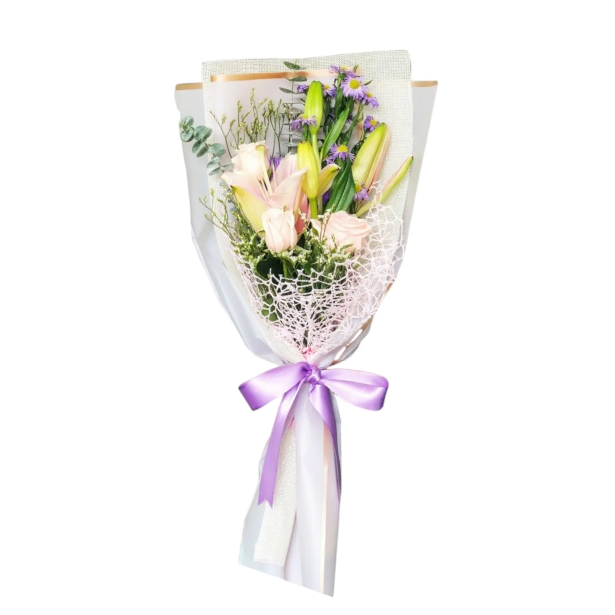 Lirios y mini rosas acompañados de aster, caspia y eucalipto en un ramillete que transmite armonía desde el primer vistazo.