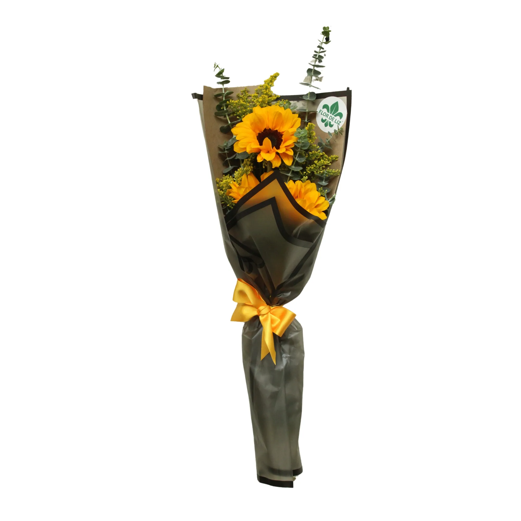 Hermoso detalle elaborado en gerberas, soliaster y eucalipto en papel de seda y lazo en cinta de tela.