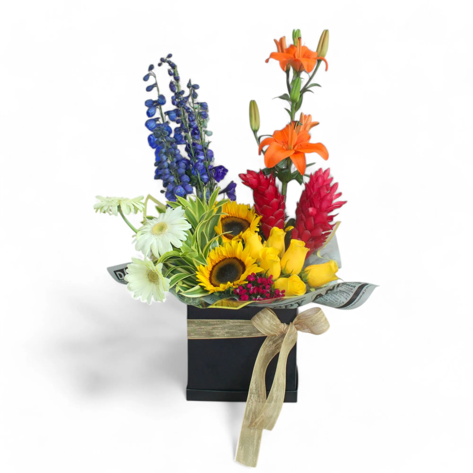 Caja decorada en girasoles, lirios, delfinios, gerberas, ginger, gipsy y cancion de la india.