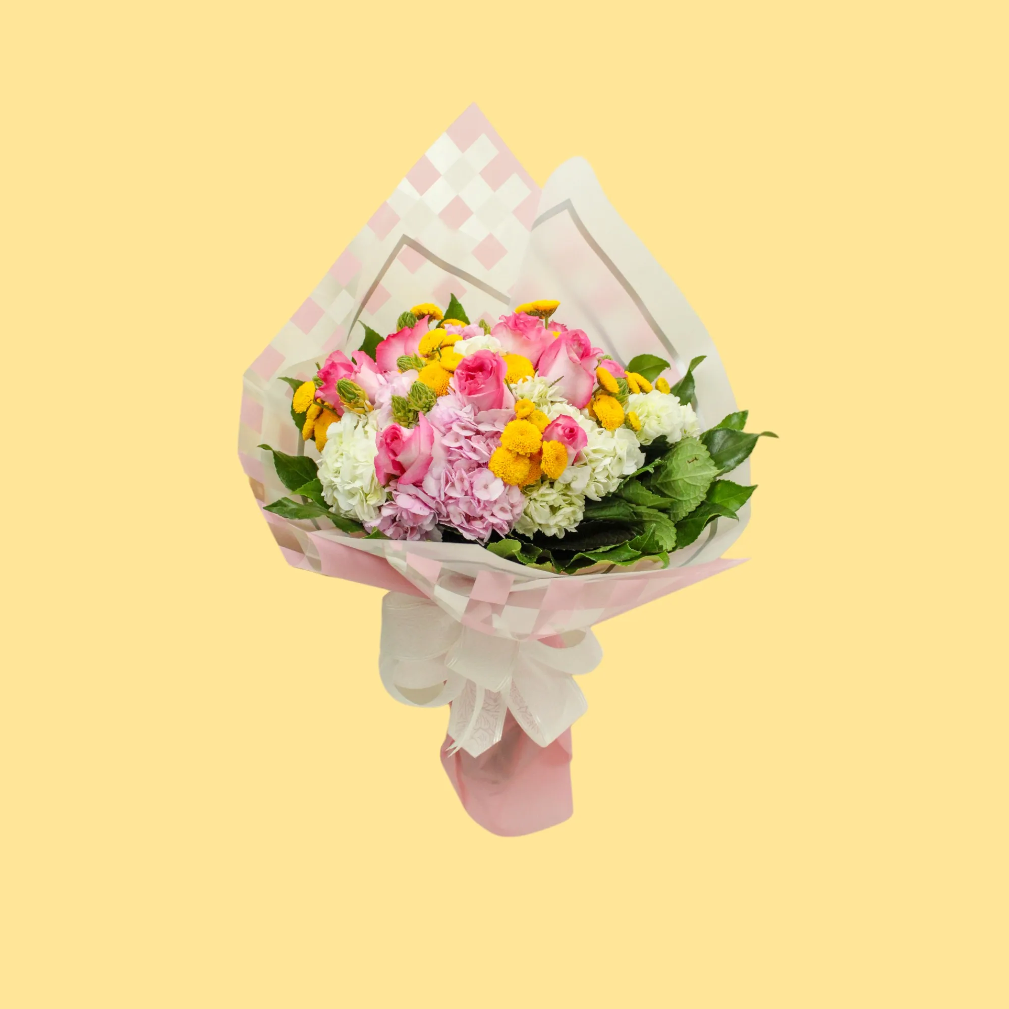Un ramillete único, con hermosas rosas, hortensias, pinoquio, estrella de Belén, coculo, papel coreano y un lazo en cinta italiana.