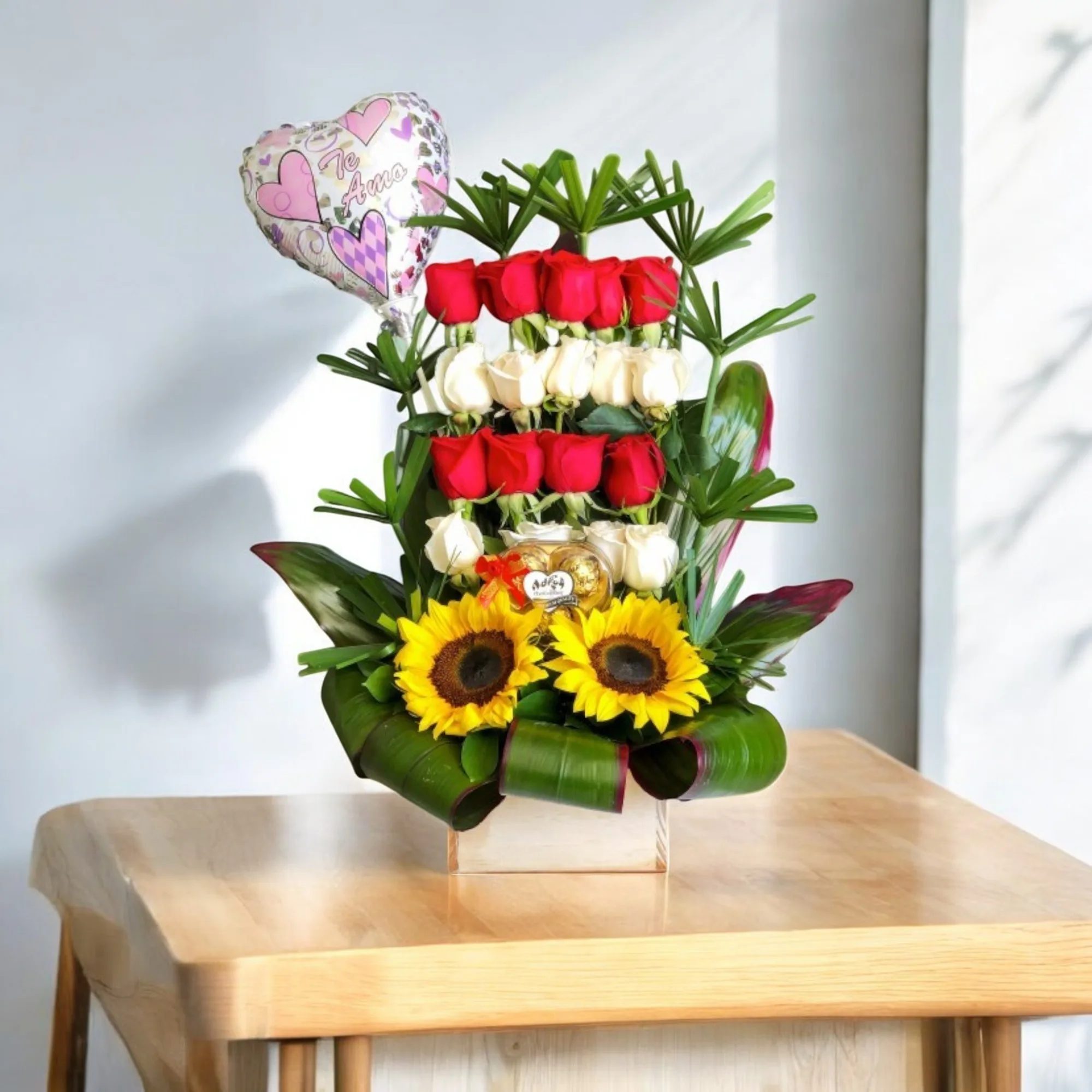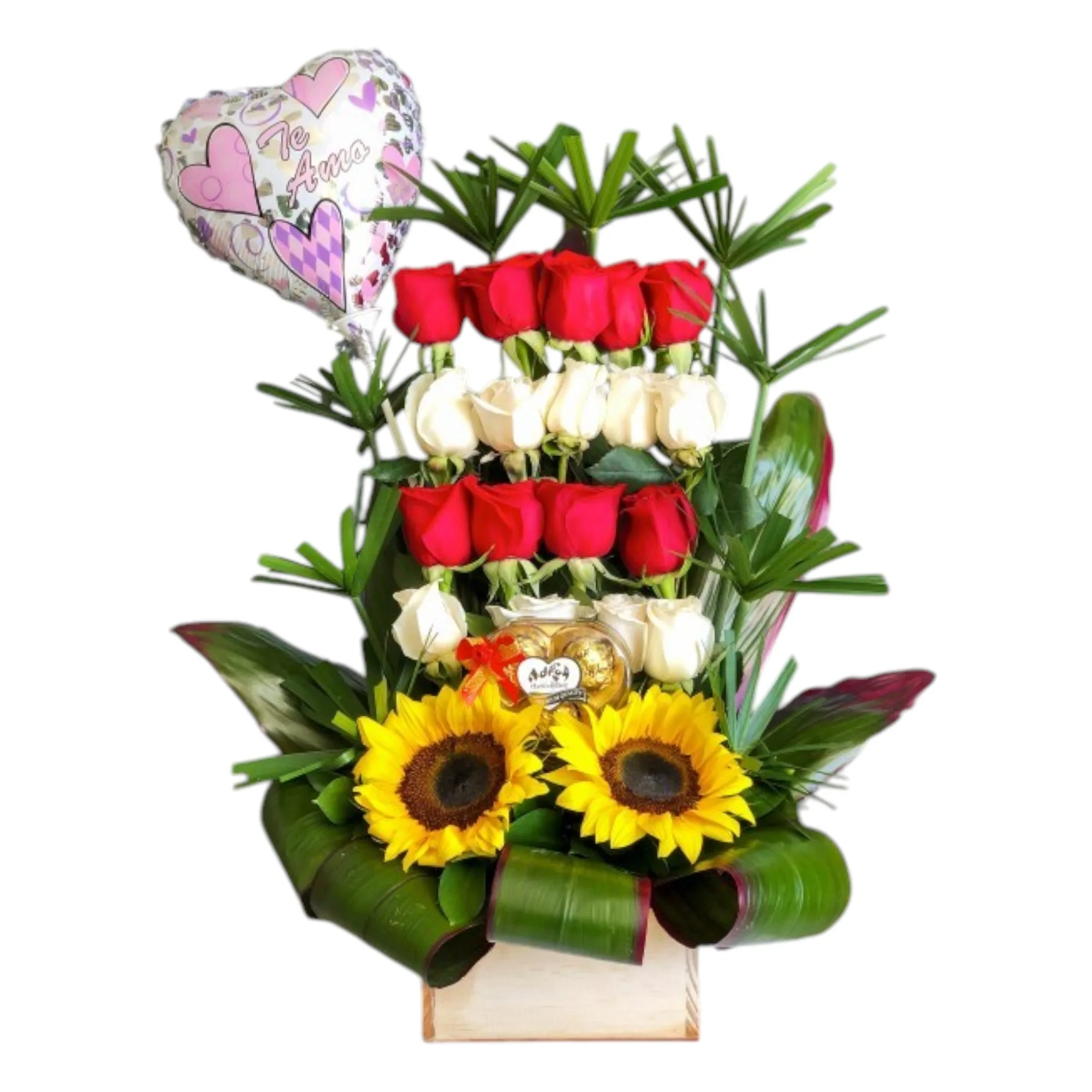 Arreglo con rosas rojas, rosas blancas, girasoles, follaje en papiros y hoja de carey.
