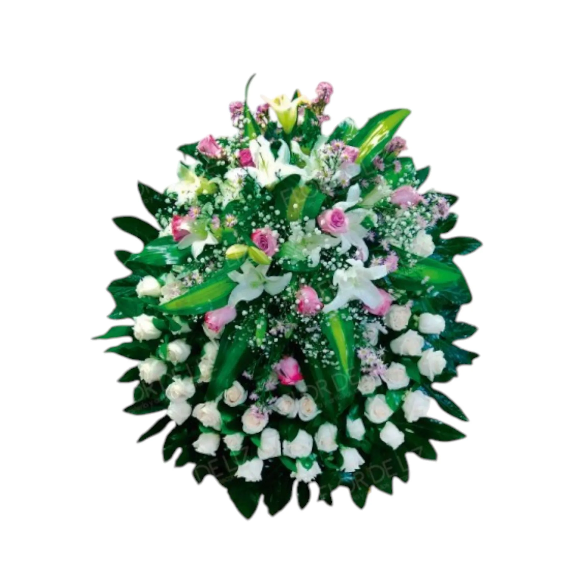 Corona elaborada en rosas blancas, manito de Dios, aplique en rosas, lirios, gypsophila y hoja de lino.