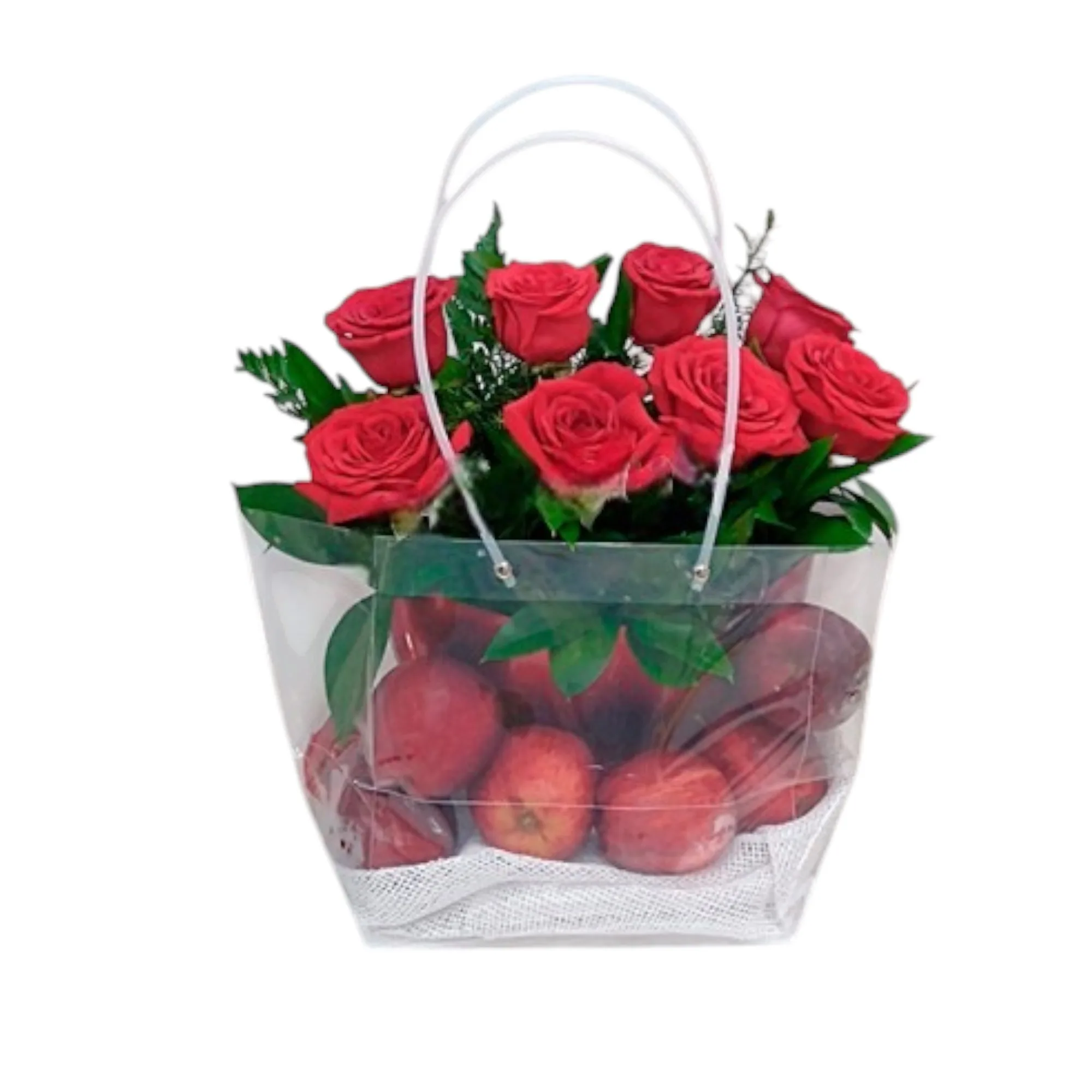 Bolsa en 8 rosas rojas, helecho cuero y rusgo acompañado de 8 manzanas.