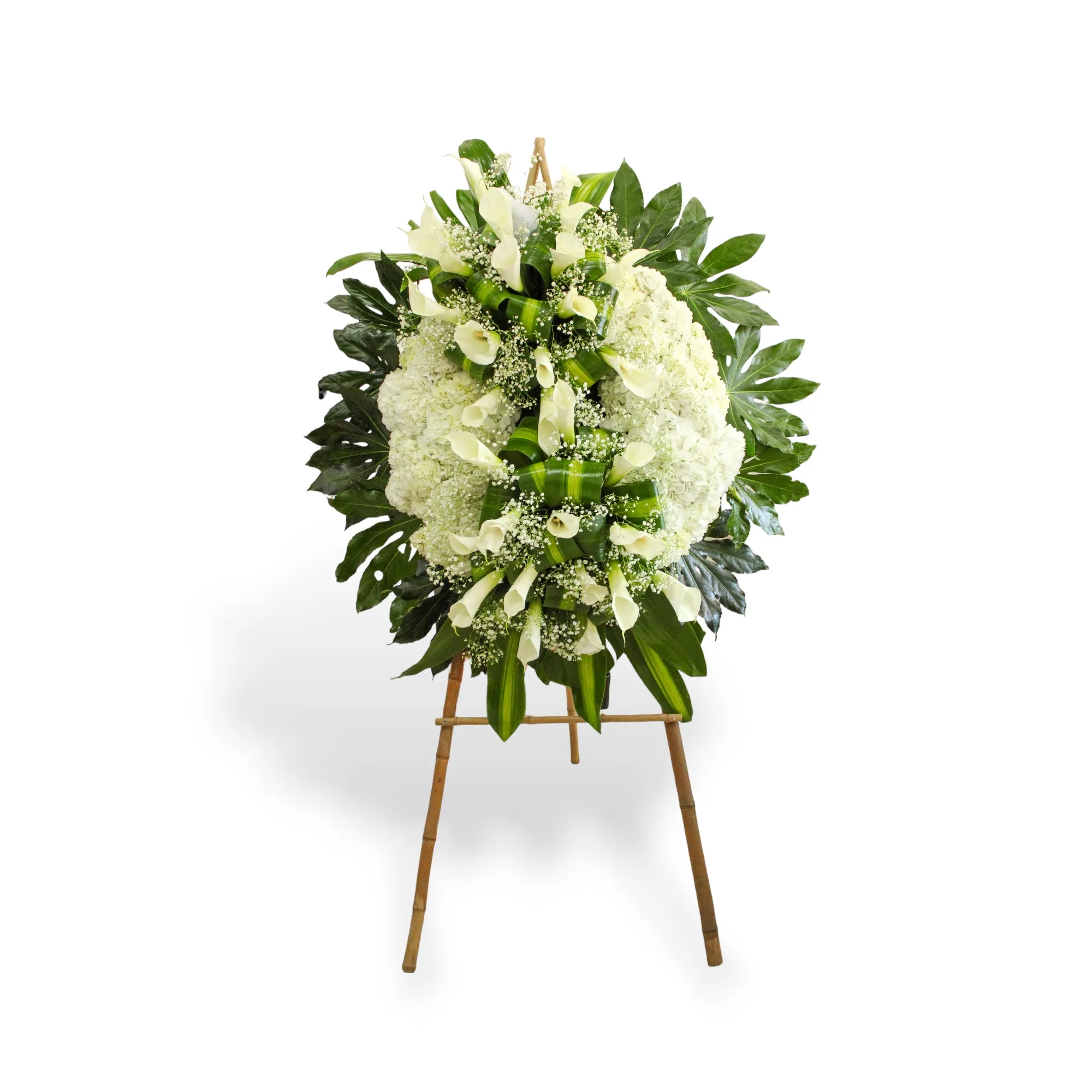 Corona elaborada en hortensias, aplique en cartuchos, gipsofilia, hoja de lino y manito de Dios.