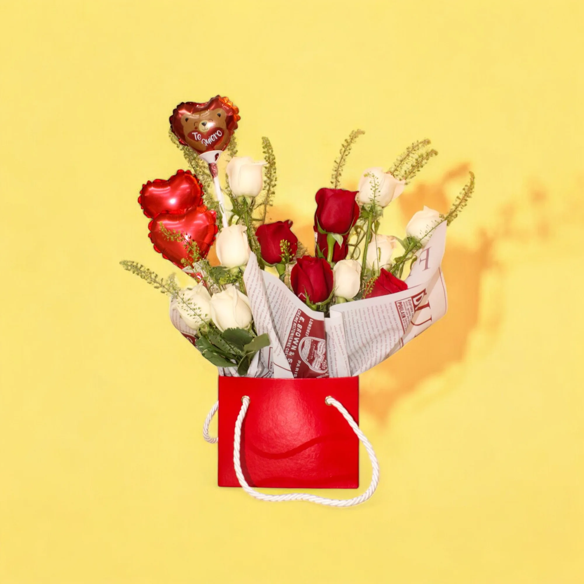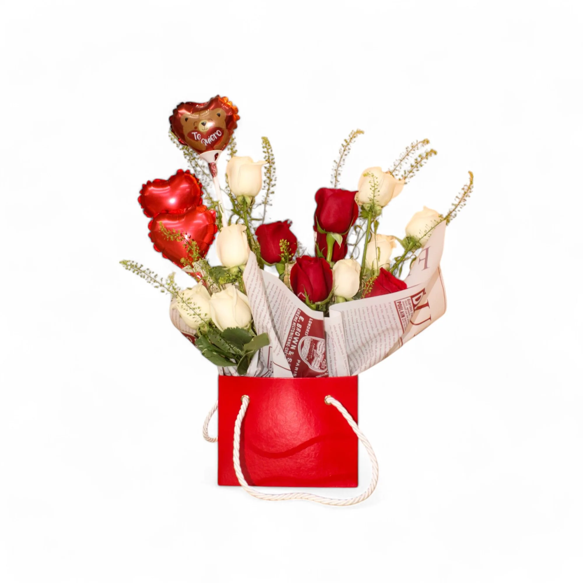 Hermosa cartera de color roja elaborada en rosas rojas y blancas, soliaster, papel coreano y 3 globos pequeños