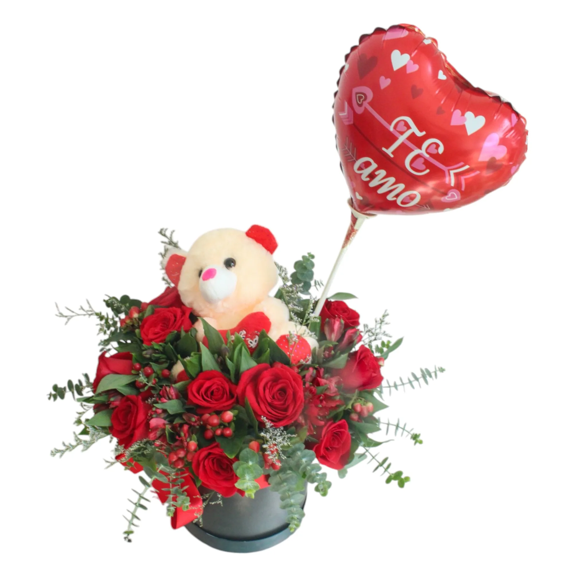 Hermosa caja decorada con Rosas Rojas, Hipérico y un tierno peluche.