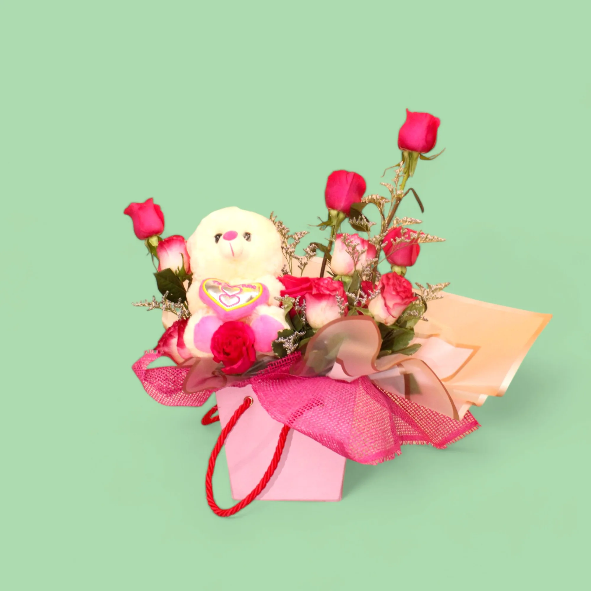 Hermosa cartera decorada cuadrada elaborada en rosas y rosas gratinadas fucisa, caspia, papel coreano, tela en malla y oso de peluche.