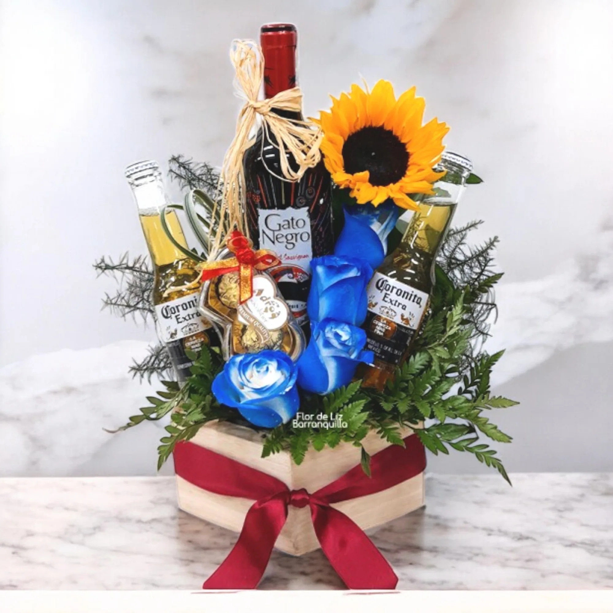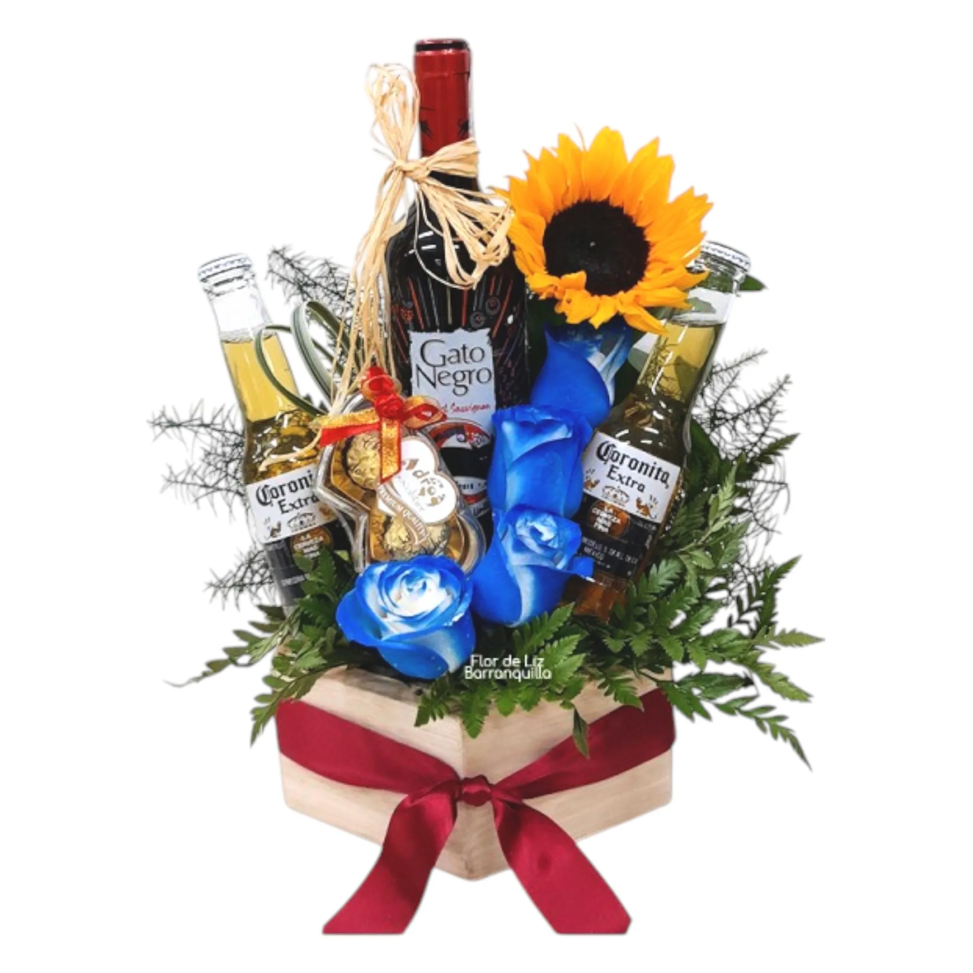Un detalle lleno de carácter y frescura, con 4 hermosas rosas azules y un girasol, acompañado de 2 cervezas, 2 chocolates y una botella de vino para brindar momentos especiales.