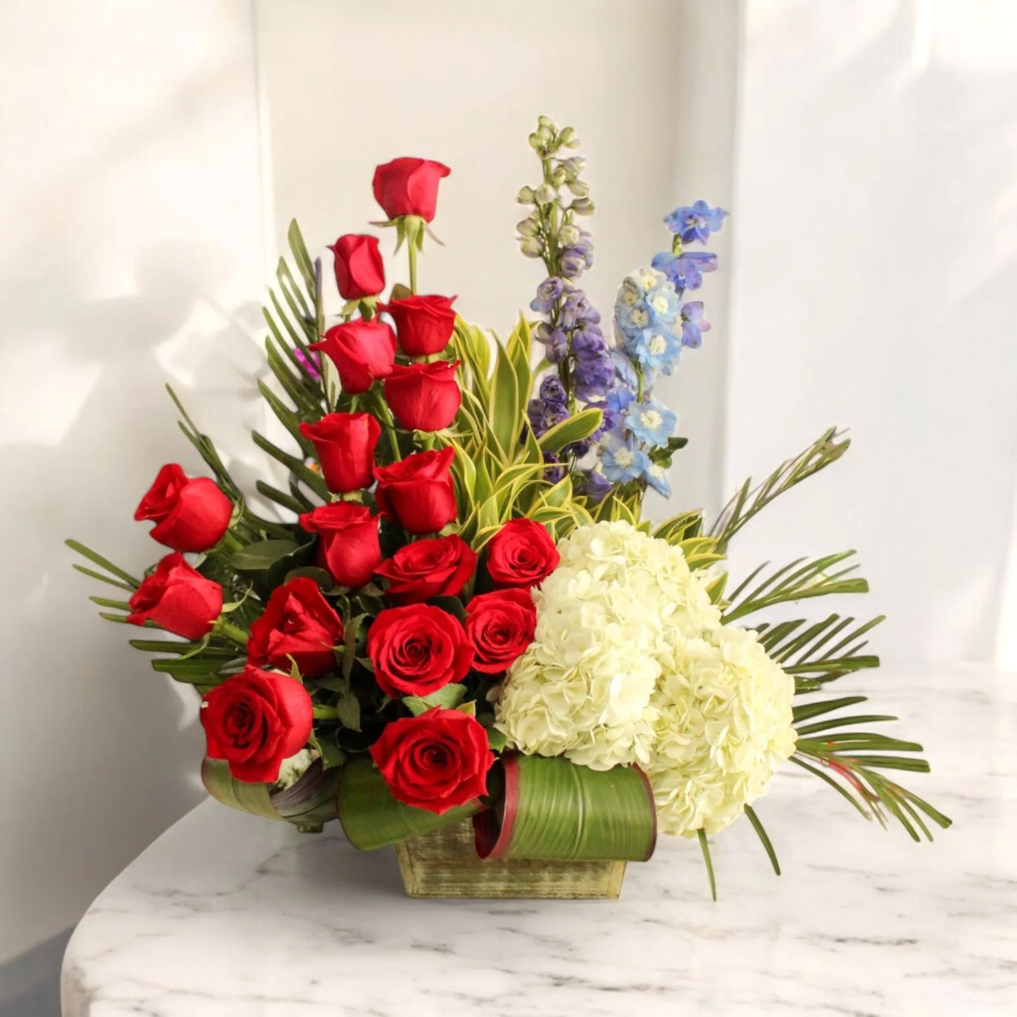 Precioso arreglo elaborado con rosas rojas, hortensias blancas y delfinios azules, complementado con follajes en canción de la India, hoja de dracena y palma de rivelino, todo en una base en canasta.