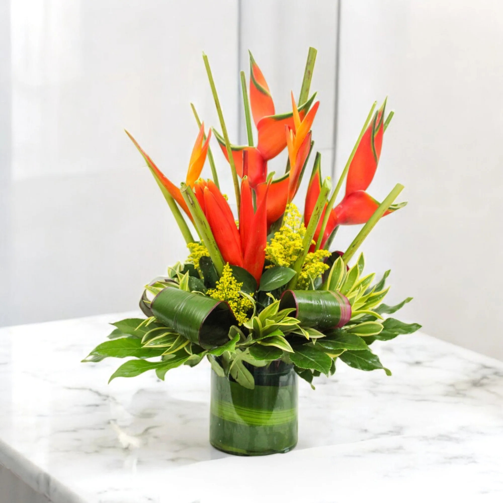 Arreglo natural en heliconias, musa, soliaster, hoja de dracena, canción de la India y follaje en Aralias.