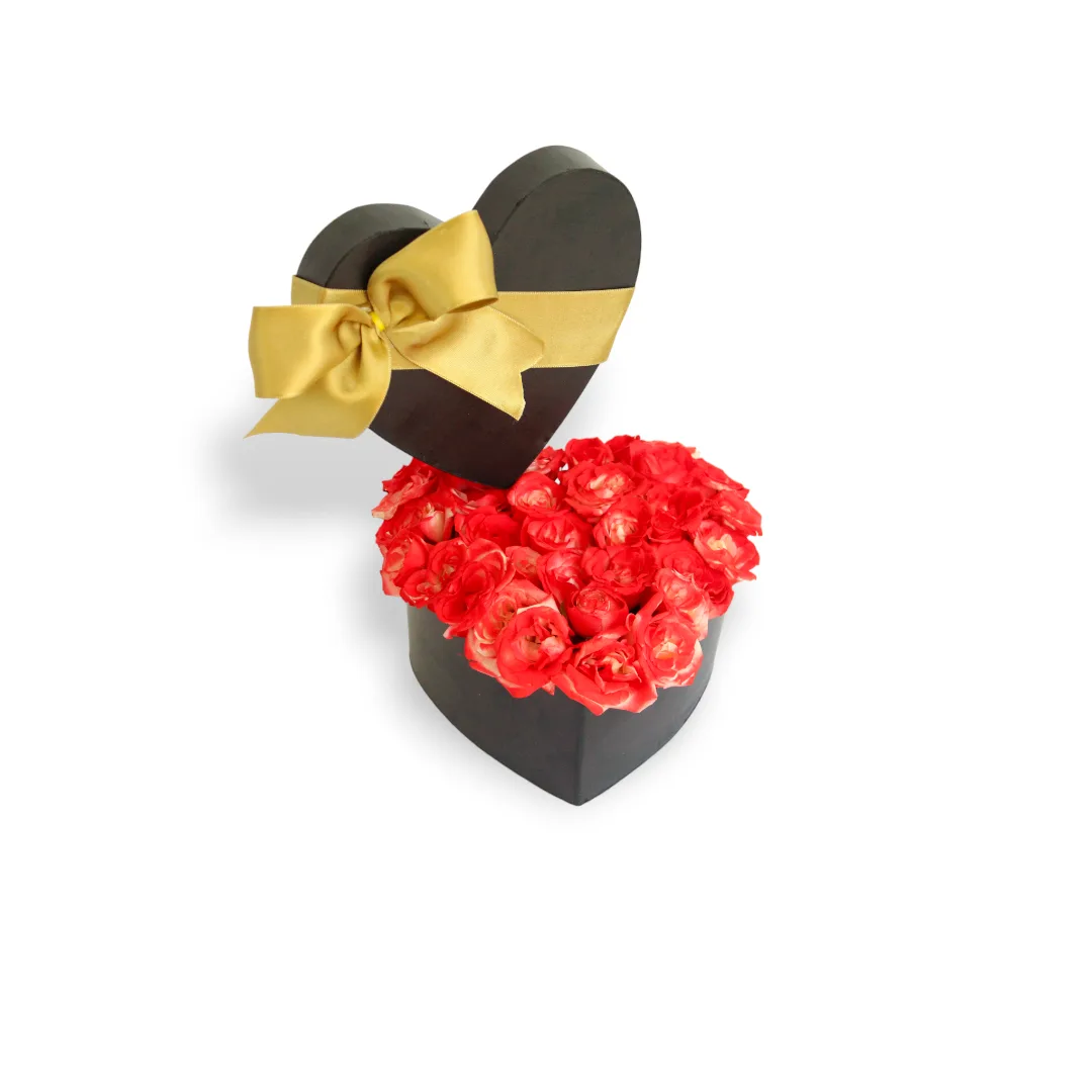 Caja en forma de corazón, decorada con mini rosas gratinadas y lazo en cinta de tela.