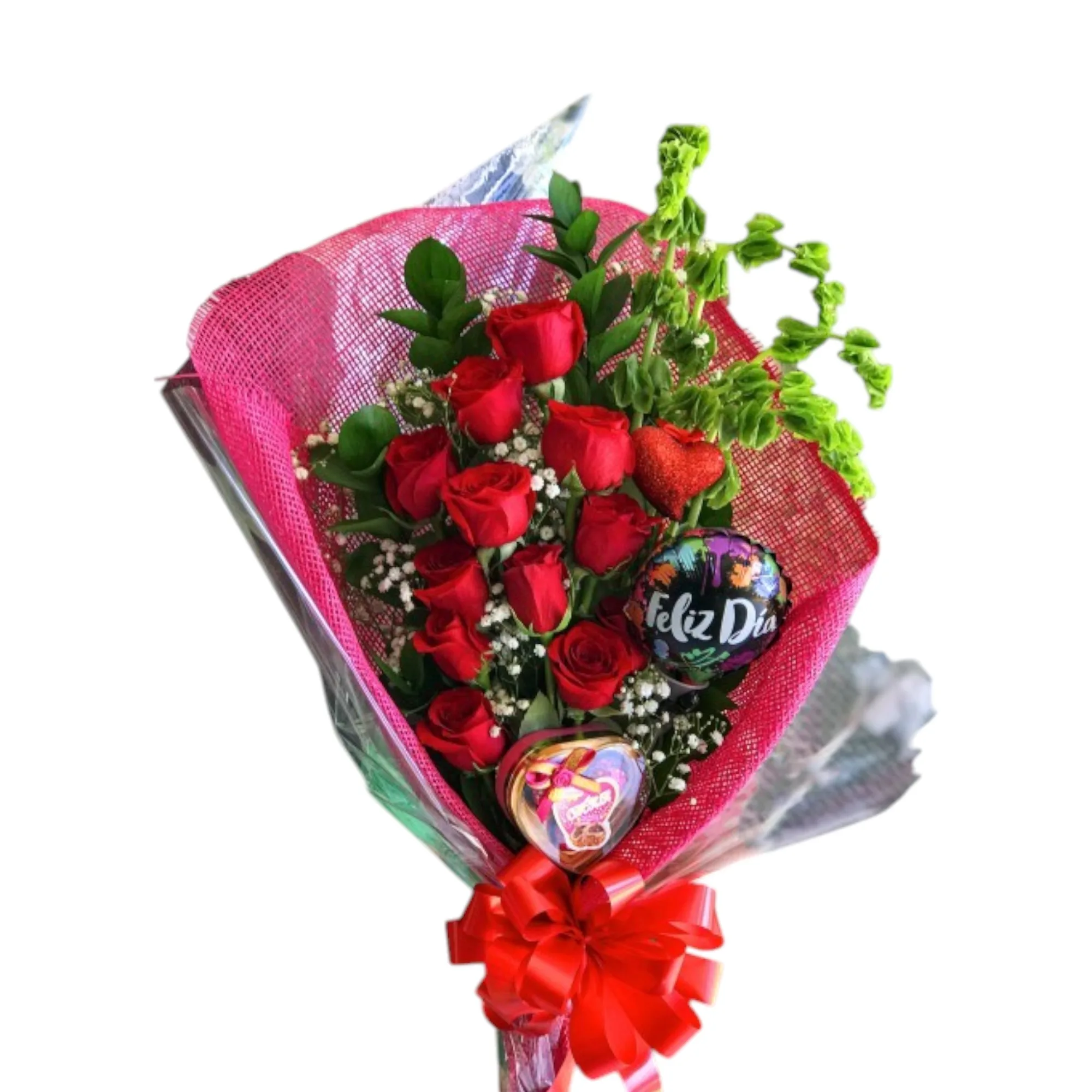 Ramillete de rosas rojas, tarjeta y chocolate, acompañado de follaje, papel decorativo y lazo.