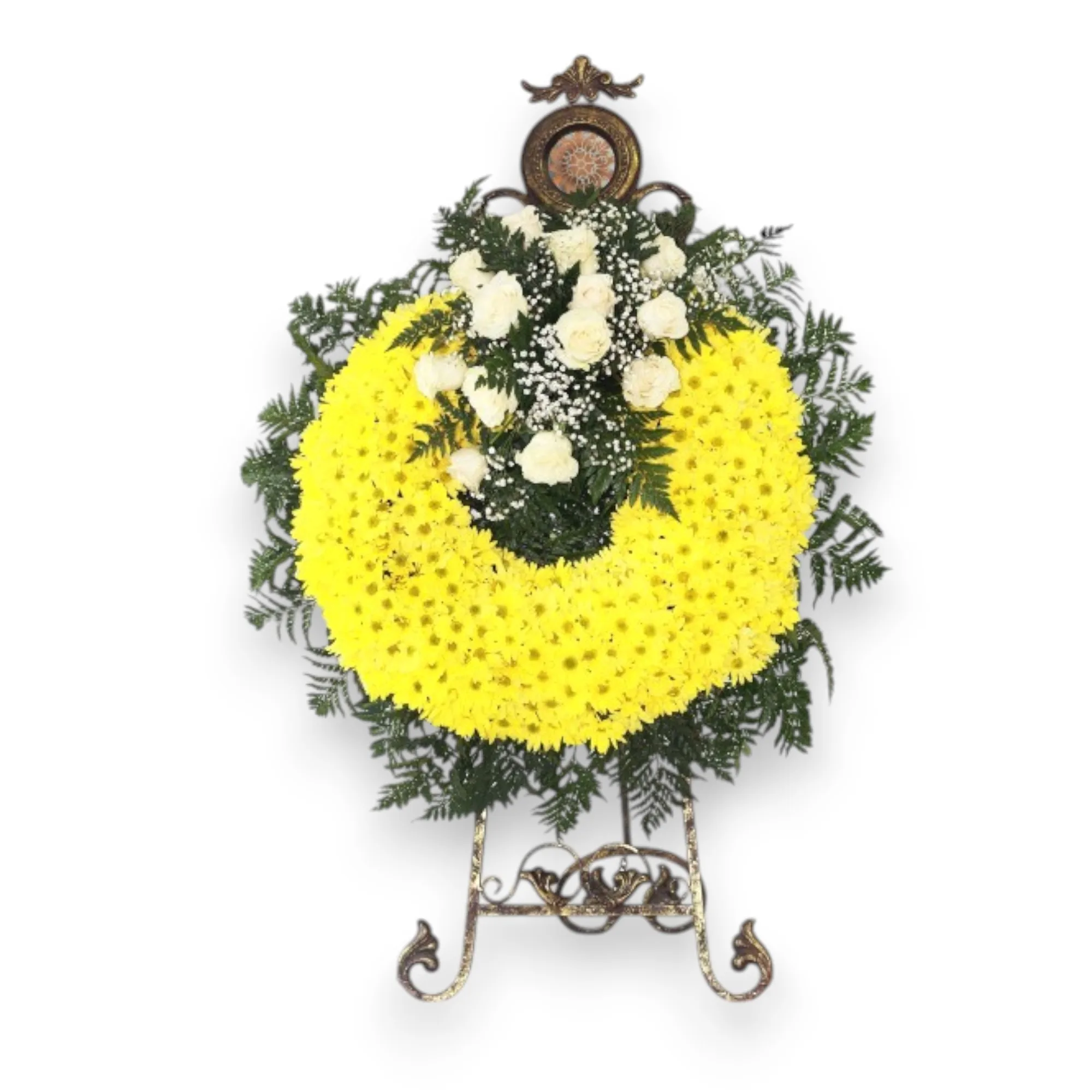 Corona en margaritas amarillas y aplique en rosas blancas.
