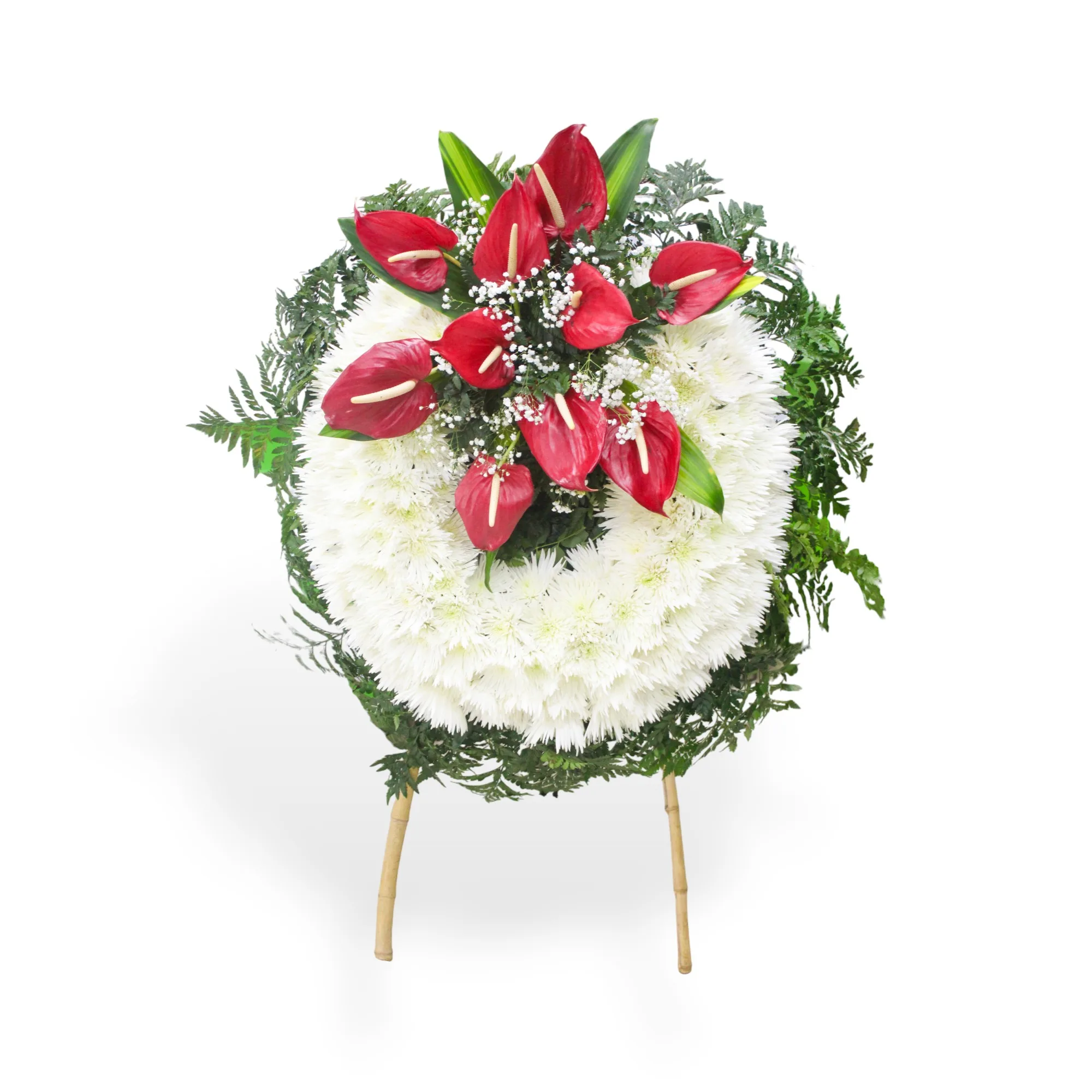 Corona elaborada con claveles, anturios, follaje en helecho cuero, hoja de lino y gipsofilia.