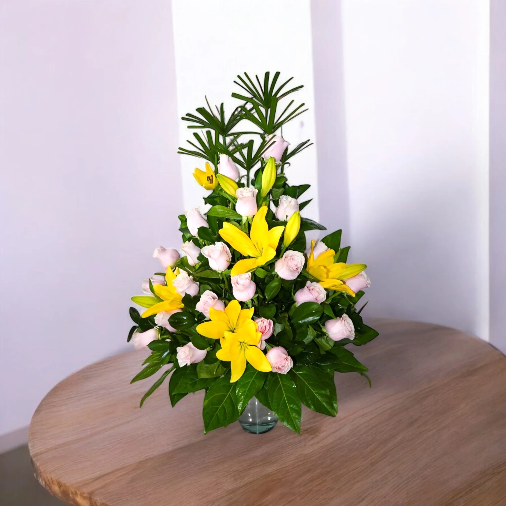 Hermoso arreglo en rosas, lirios, papiros, rusgo, follaje, base vidrio.