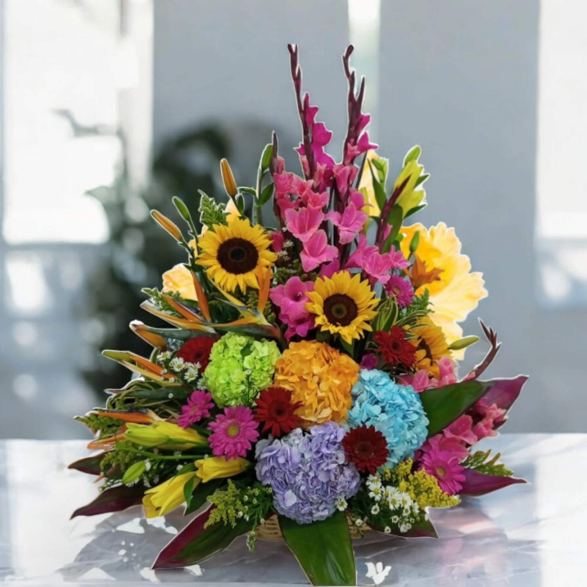 Arreglo floral lleno de vida y color, elaborado con girasoles, gerberas, lirios, hortensias, gladiolos, ave del paraíso, gipsofila, canción de la India, rusgo y helecho cuero.