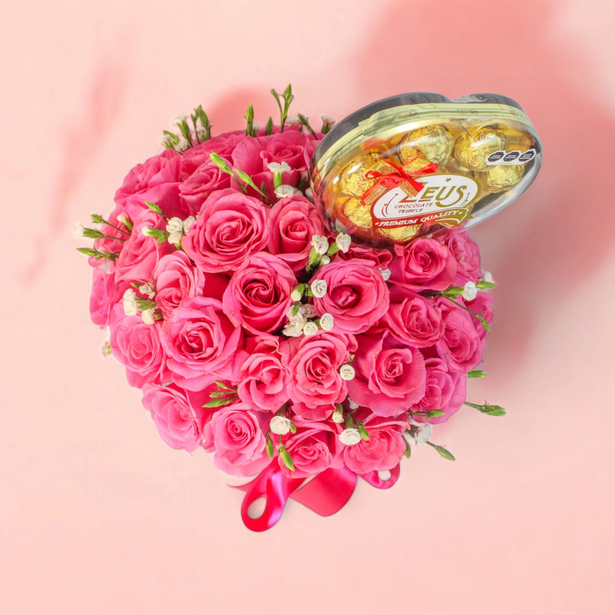 Delicada caja decorada redonda elaborada con rosas rosadas, solo mias blancas, caja de chocolate Zeus x8 y lazo en cinta de tela.