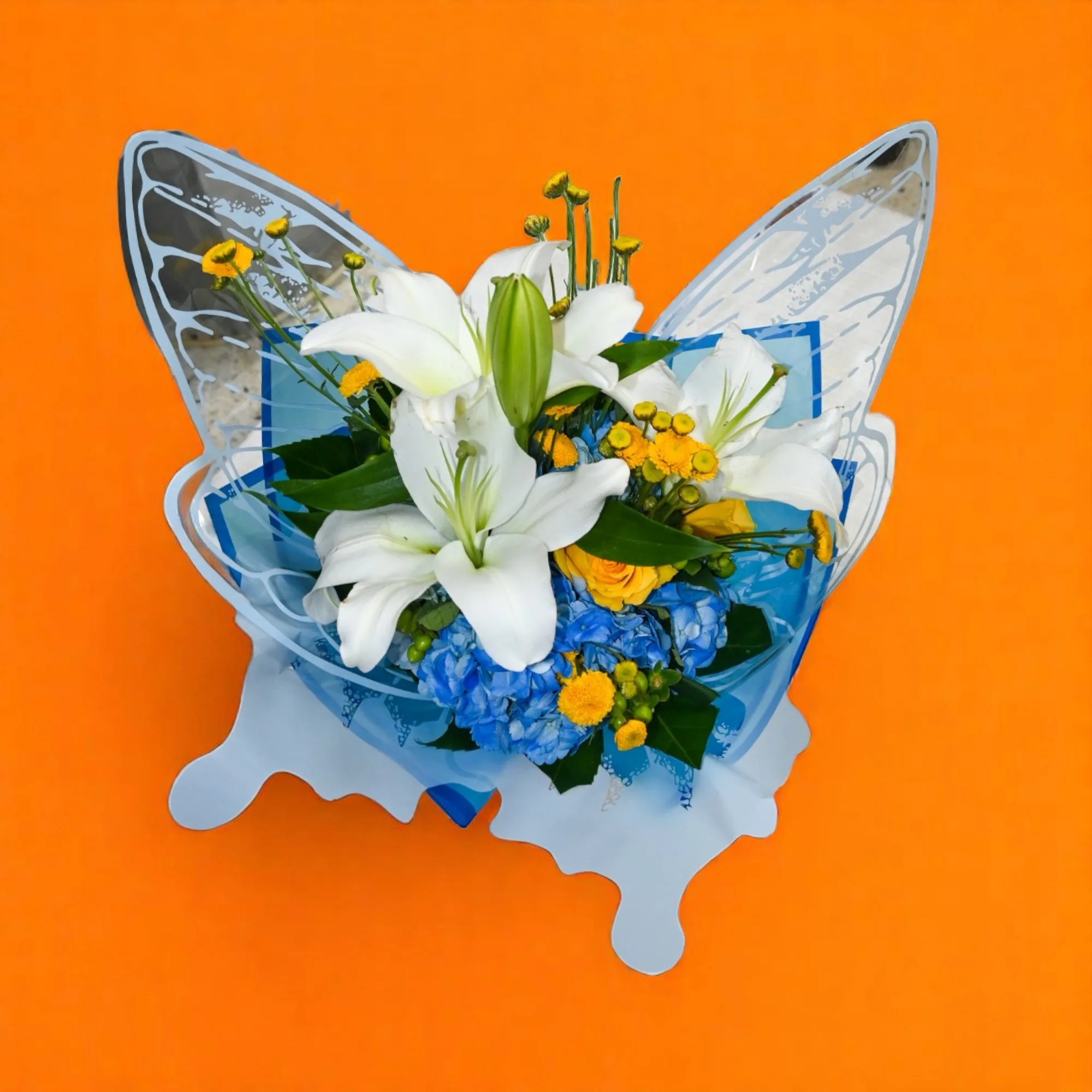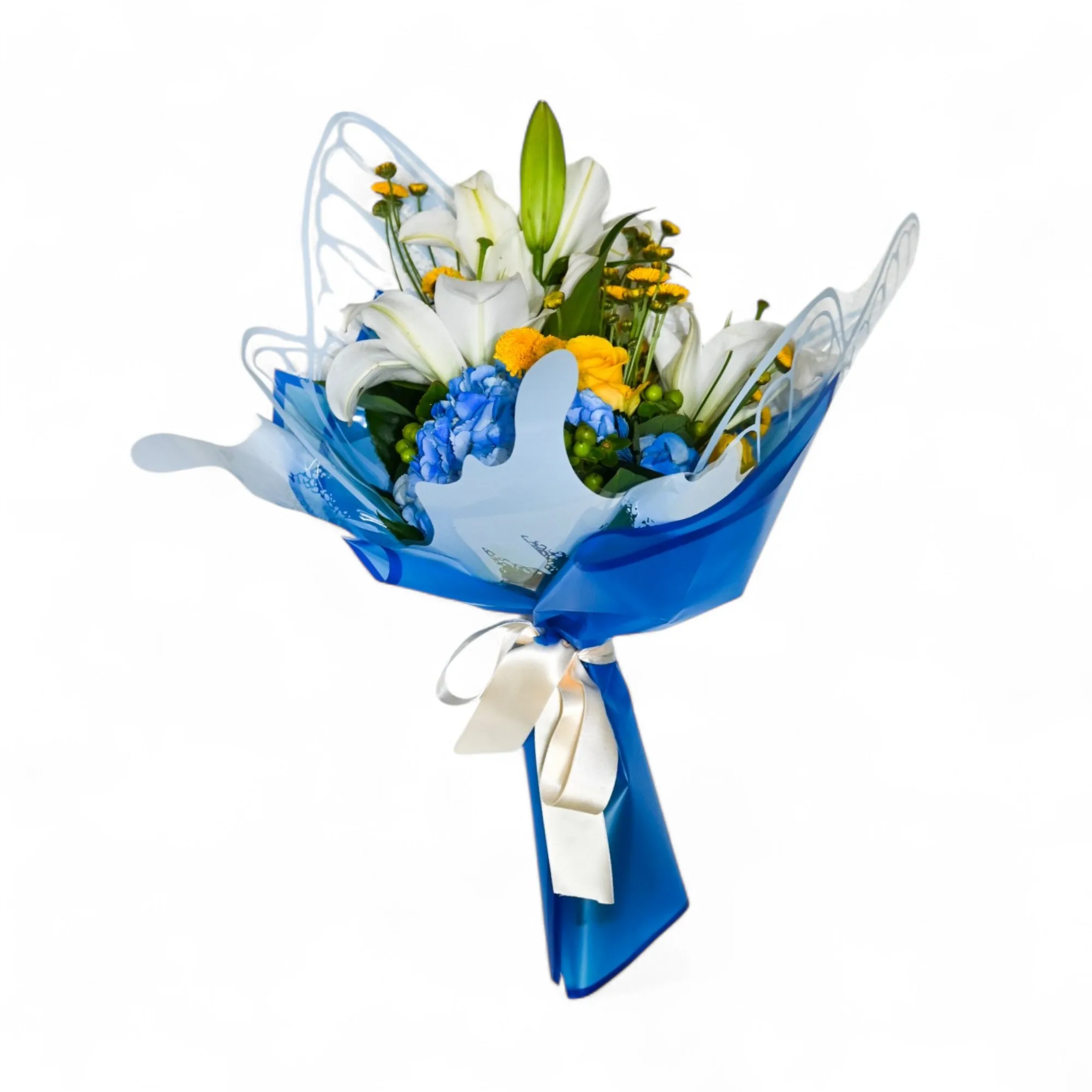 Delicado ramillete elaborado con lirios, hortensias, rosas, pinoquios y cafeto, envuelto en un hermoso papel mariposa y lazo en cinta de tela.